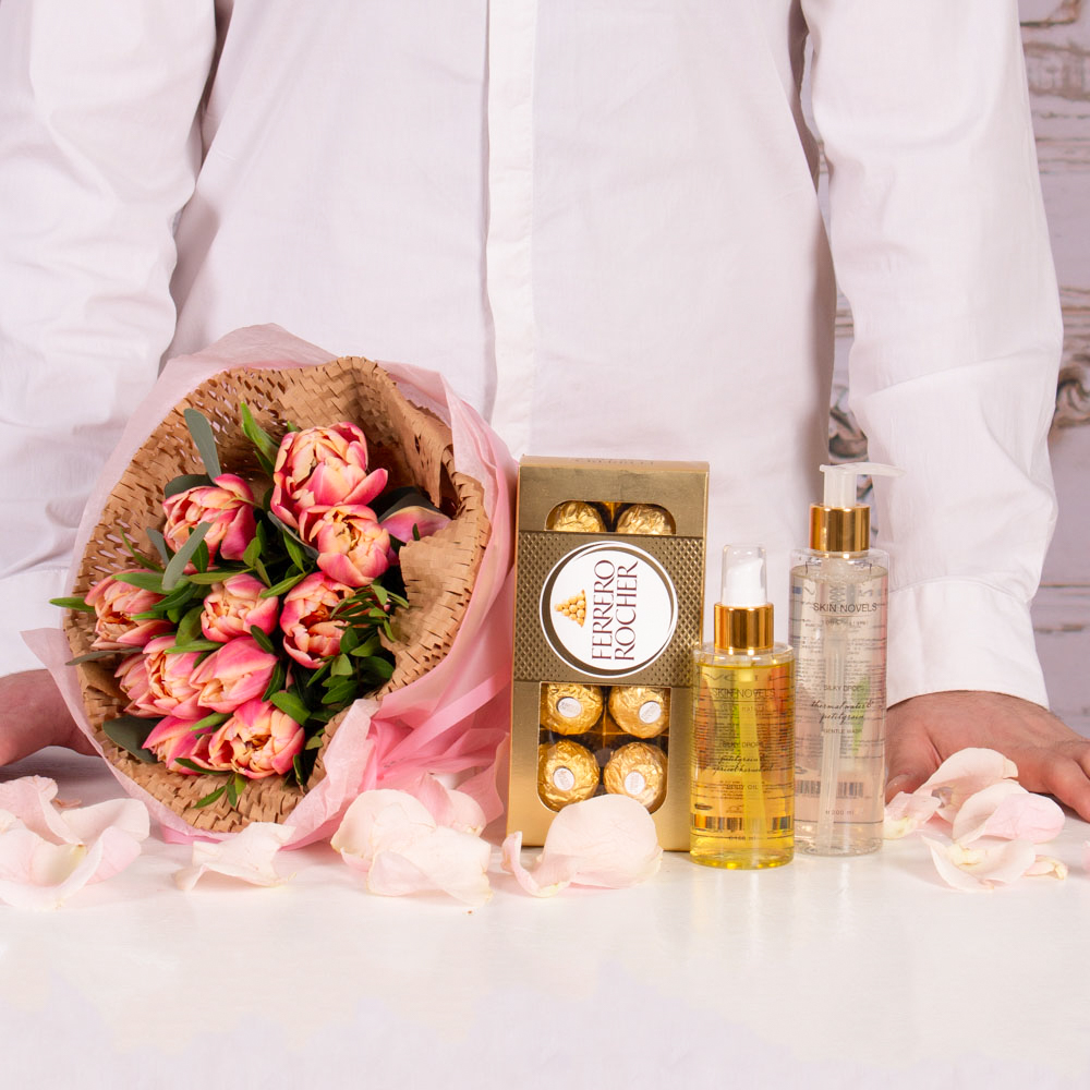 The most special occasions need special gifts. Order this gift with pink tulips, chocolate pralines, natural body oil and cleaning gel and turn an ordinary day into a beautiful memory. Designed specifically for women, whether you want to give it to your mother, girlfriend, colleagues, or other women you know, they will surely appreciate that you’ve thought of them.