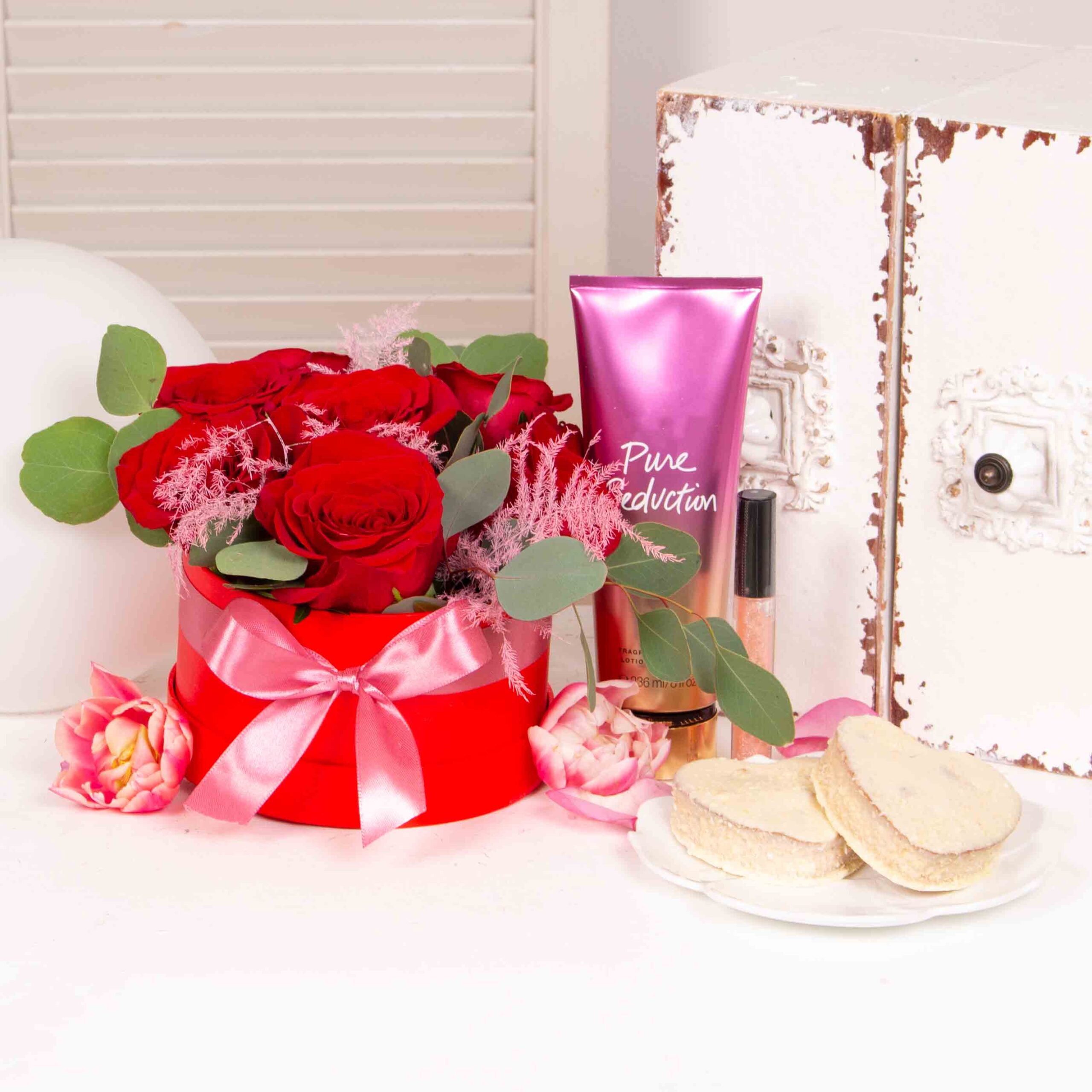 The most special occasions need beautiful gifts. And we couldn’t let Valentine’s Day pass without doing one. Order this gift with 7 red roses arrangement in box , lipgloss, white chocolate and coconut flakes cakes, body lotion and turn this evening into a memorable one.