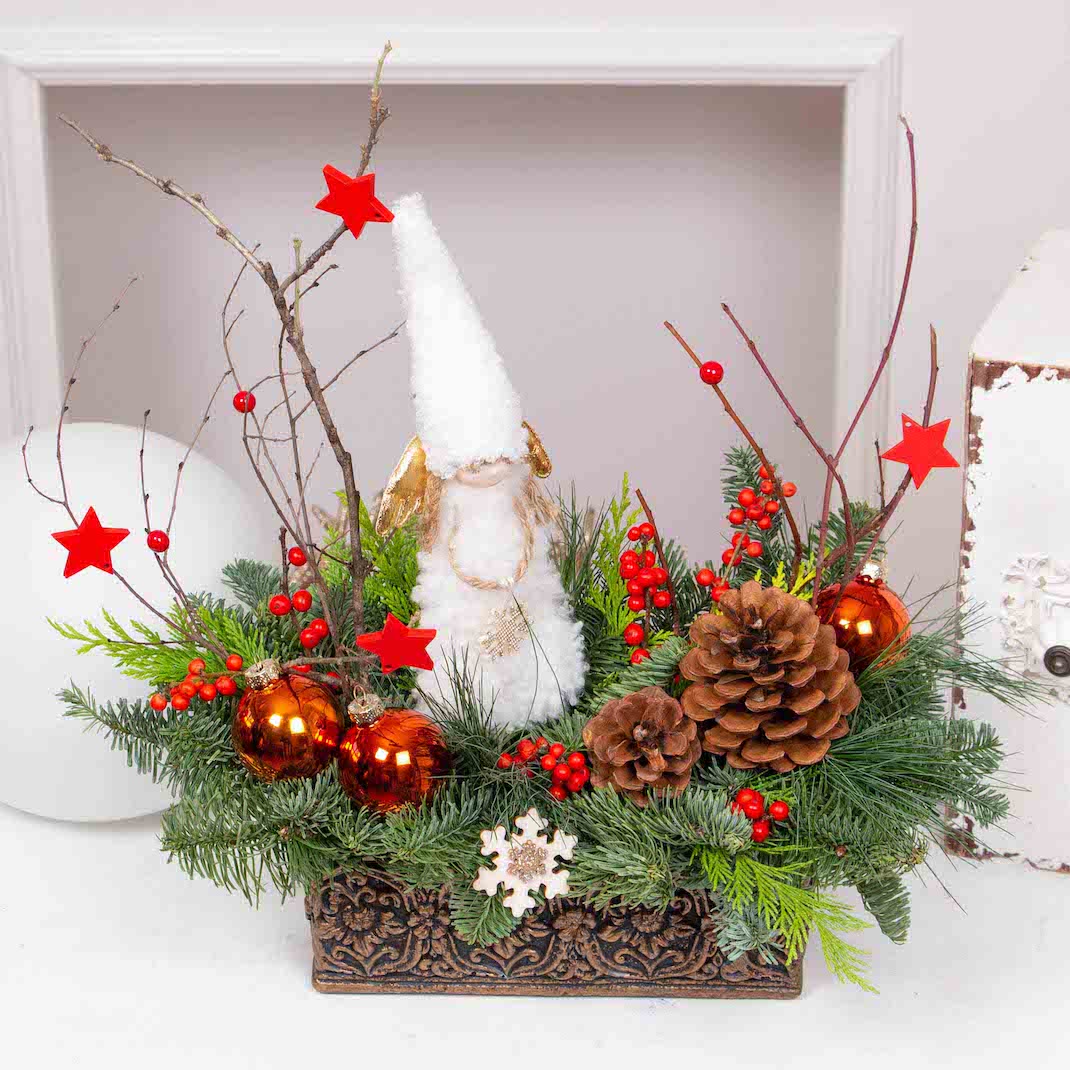 Christmas is the most beautiful time of the year and reminds us of childhood. We all like to give and receive beautiful presents. And for sure we love to make our beloved ones happy. This Christmas arrangement with natural fir , figurine , cone pine and globes is the perfect gift to surprise our friends and family. We need to add only a cup of hot tea, carols and maybe a fireplace. Inspired by this jolly picture we created all these beautiful Christmas arrangements.