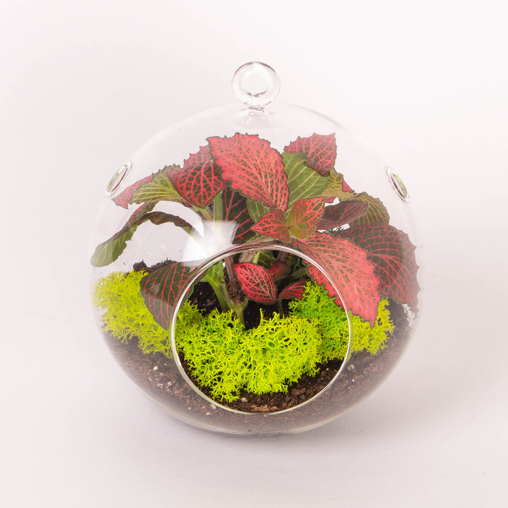 Glass globe, green moss and fittonia plant