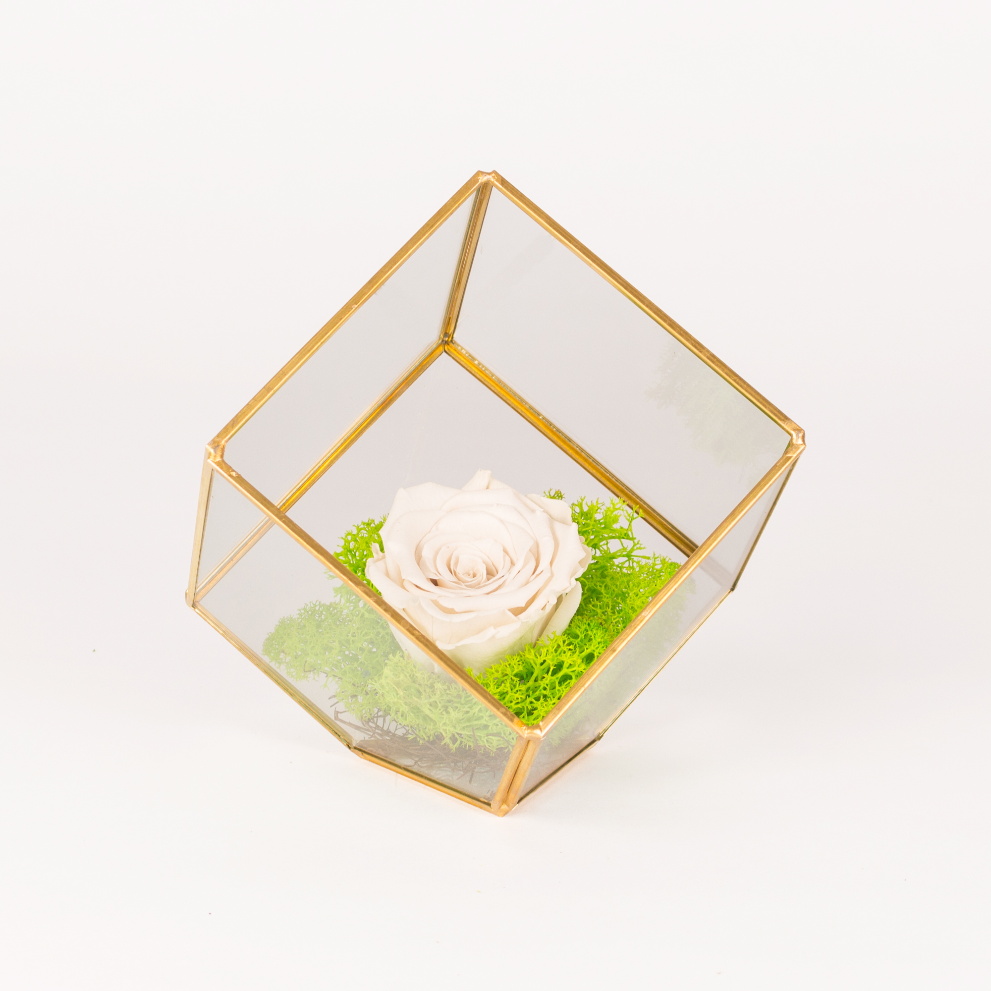 Cube prism L13cm h20cm with white preserved roses, green moss and small nest.