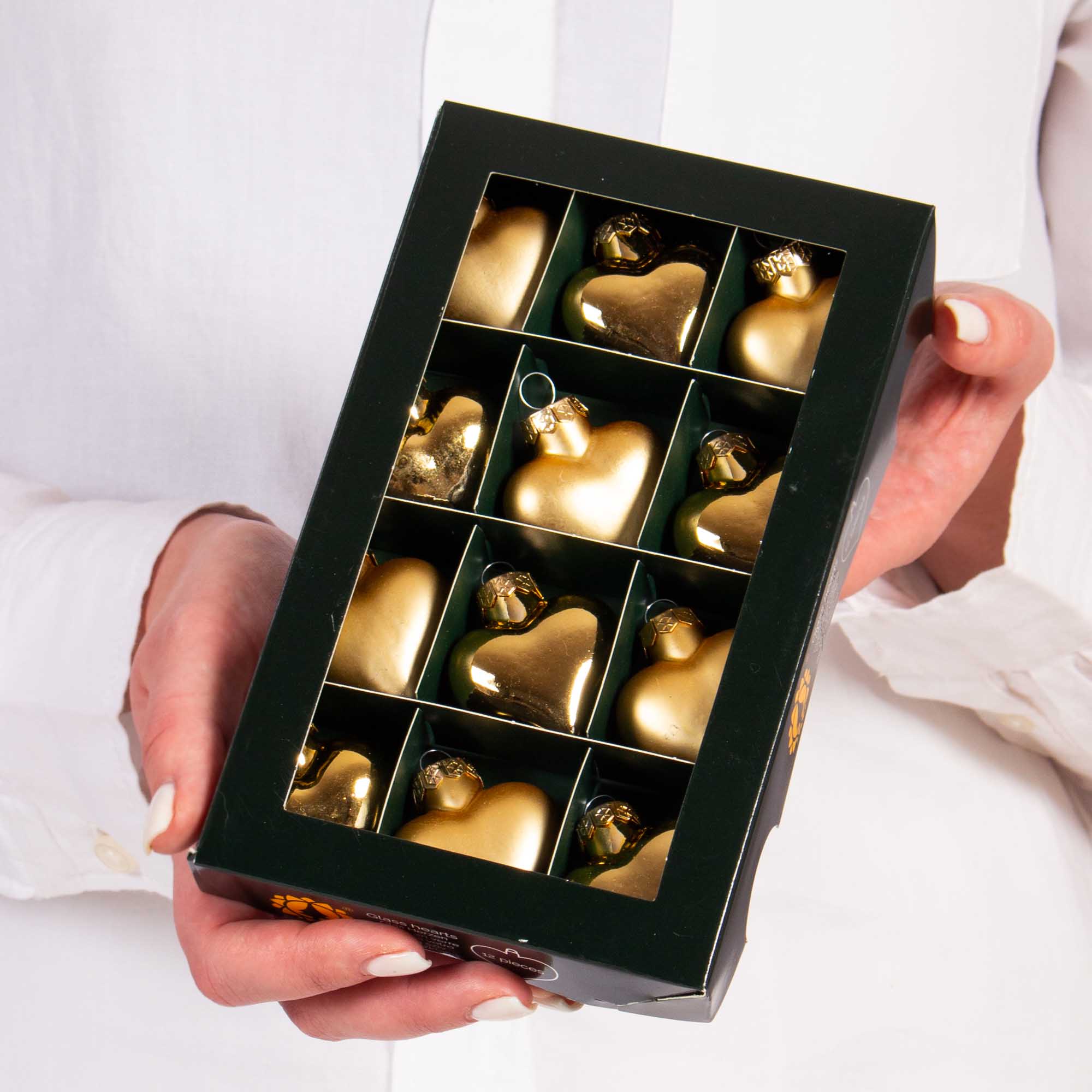 Glass globes 4 cm, heart, glossy and matte gold, set of 12 pcs