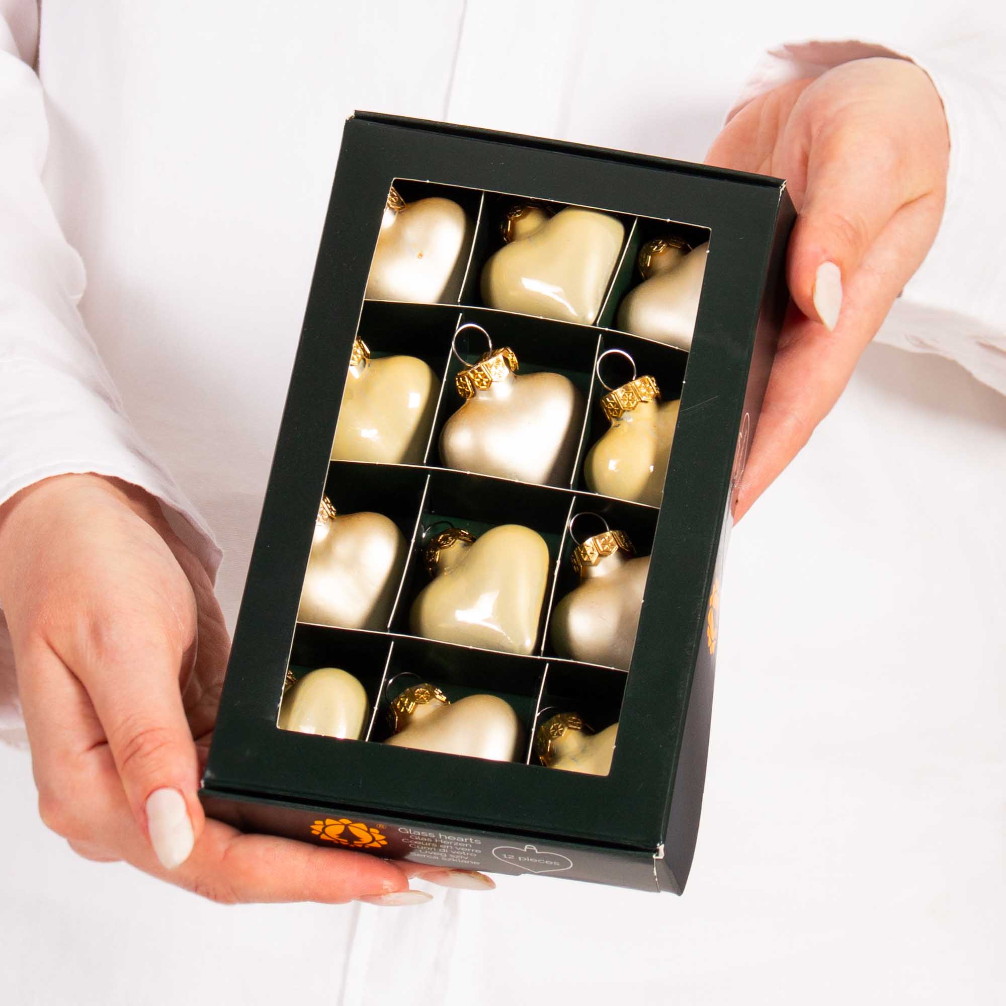 Glass globes 4 cm, heart, golden cream, set of 12 pcs