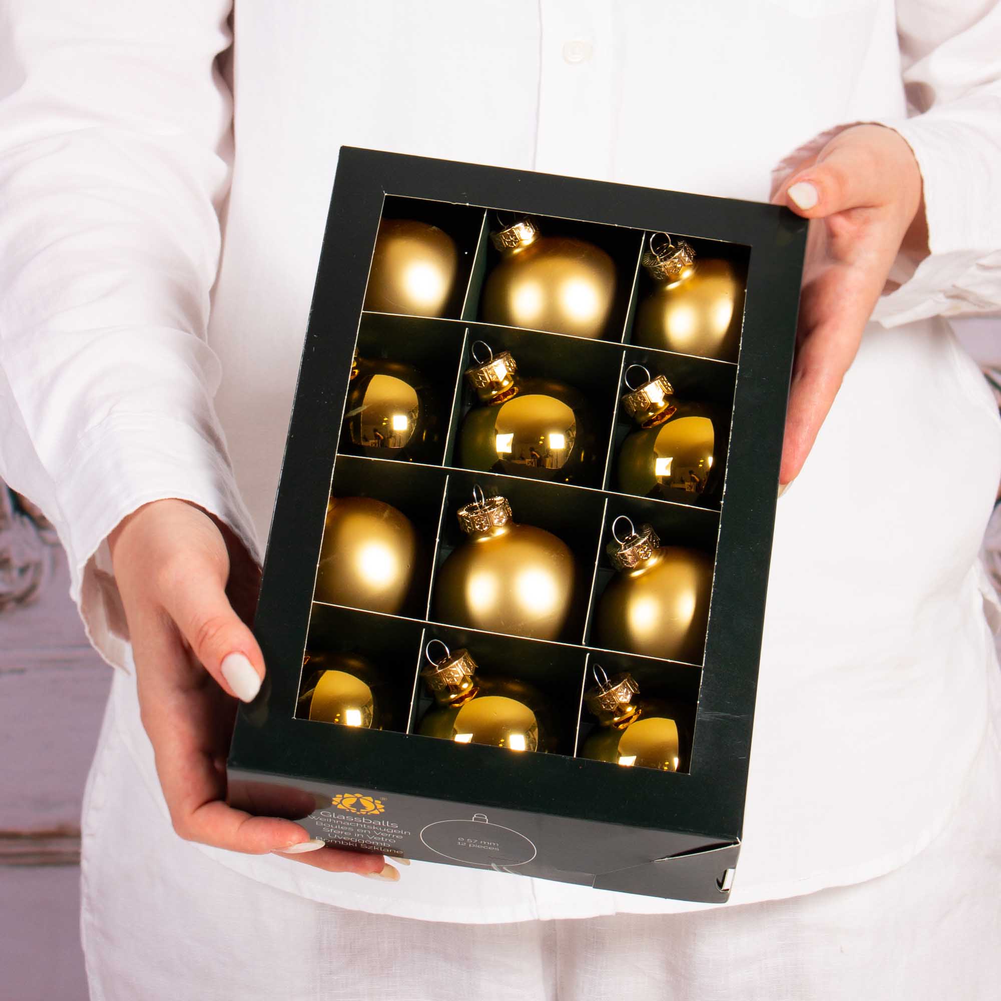 Glass globes 5.7 cm, glossy and matte gold, set of 12 pcs