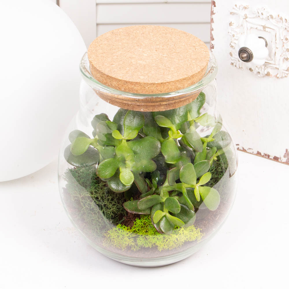 Jar with cork lid with led light, succulent plant crasulla ovata, moss and greenery for decoration.
