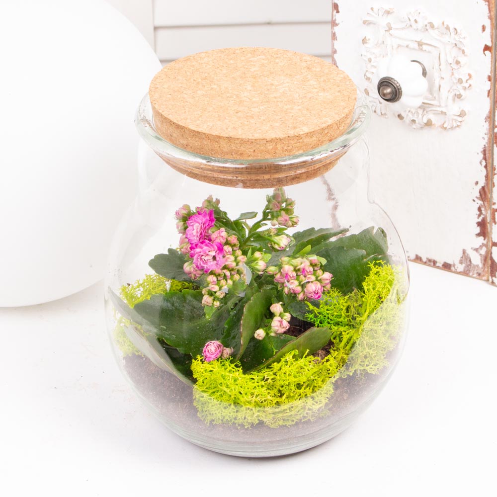 Terarium in a jar with a cork lid with led light, kalanchoe plant, moss verdet and greenery for decoration.