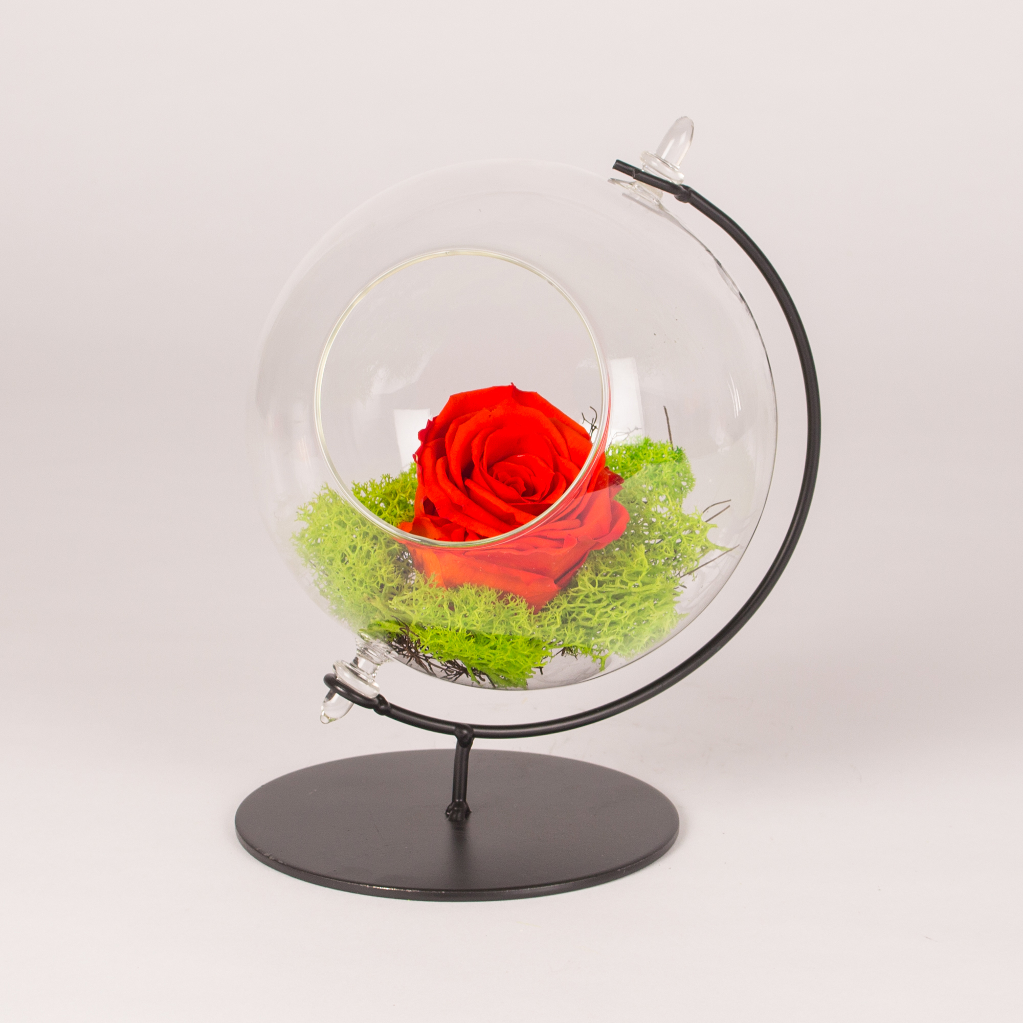 Glass globe d16cm h20cm with orange preserved rose, green moss and small nest.