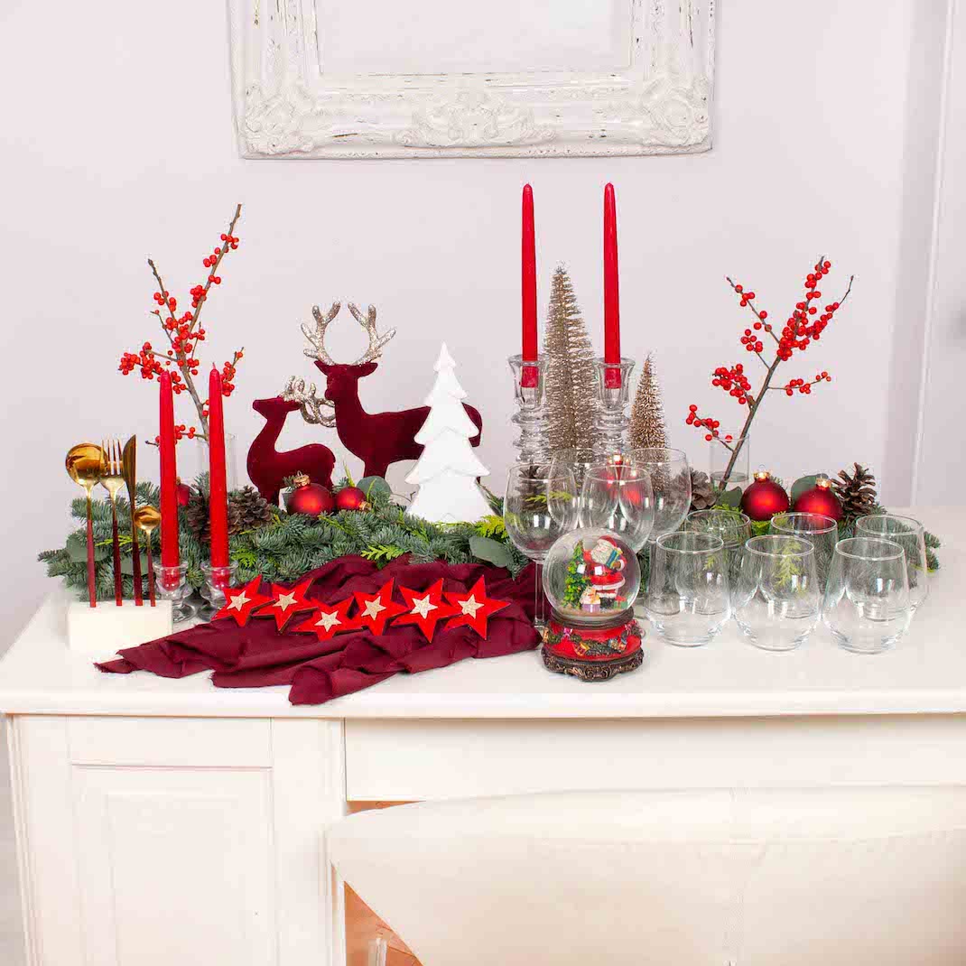 Garland 6 persons, 6 large red globes, 10 dried pine cones, 2 small glass candlesticks, 2 large glass candlesticks, 4 red candles, small golden fir, large golden fir, 6 wine glasses, 6 water glasses, 24 cutlery, 6 napkins, 6 red cloth napkins and other decoration elements.