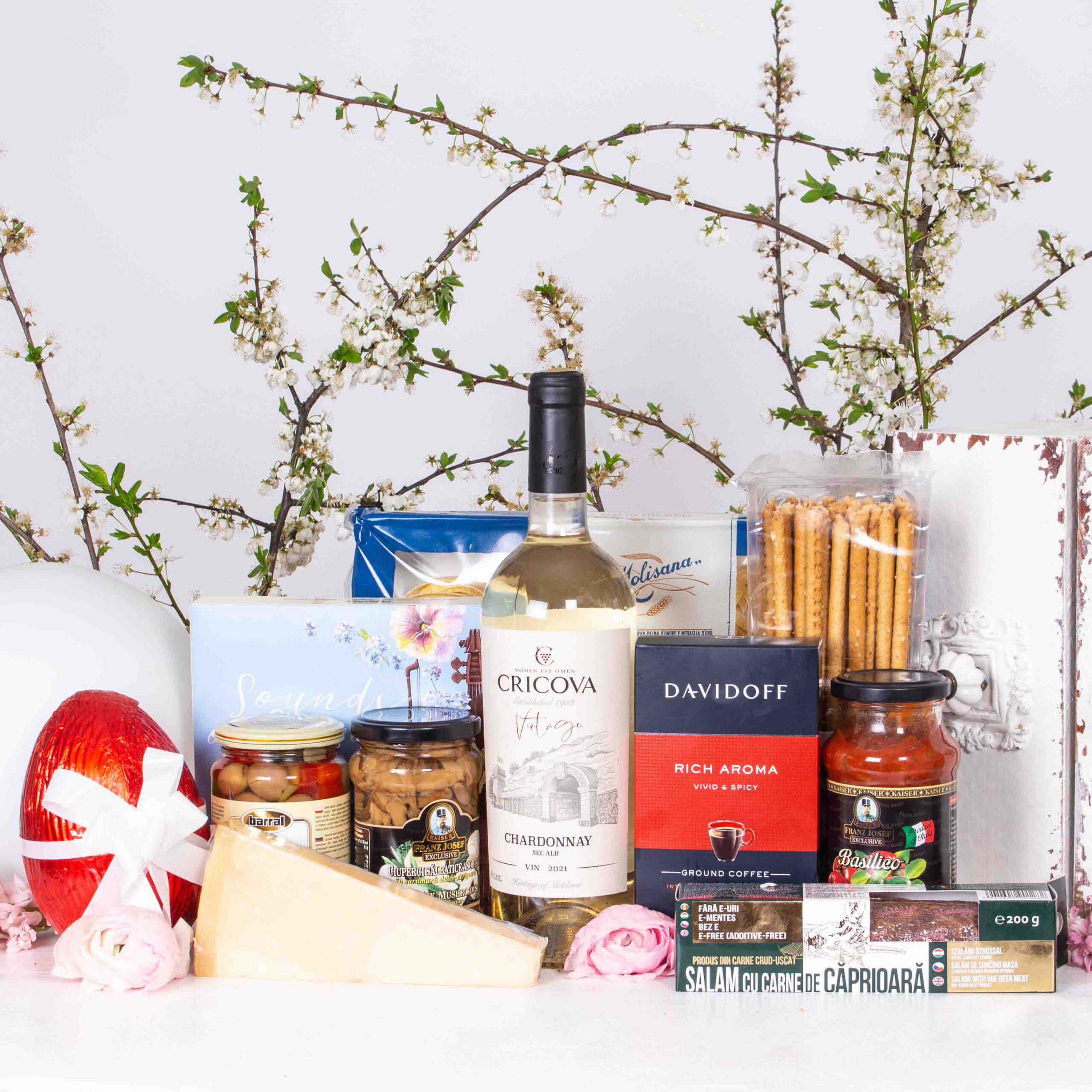 Gift with chocolate egg, milk chocolate Pergale candies, barral olives, Franz Josef mushrooms, Molisana tagliatelle pasta, Salza salt breadsticks, Franz Josef basillico sauce, venison salami, Parmigiano Reggiano zanetti cheese, Davidoff coffee and Cricova wine