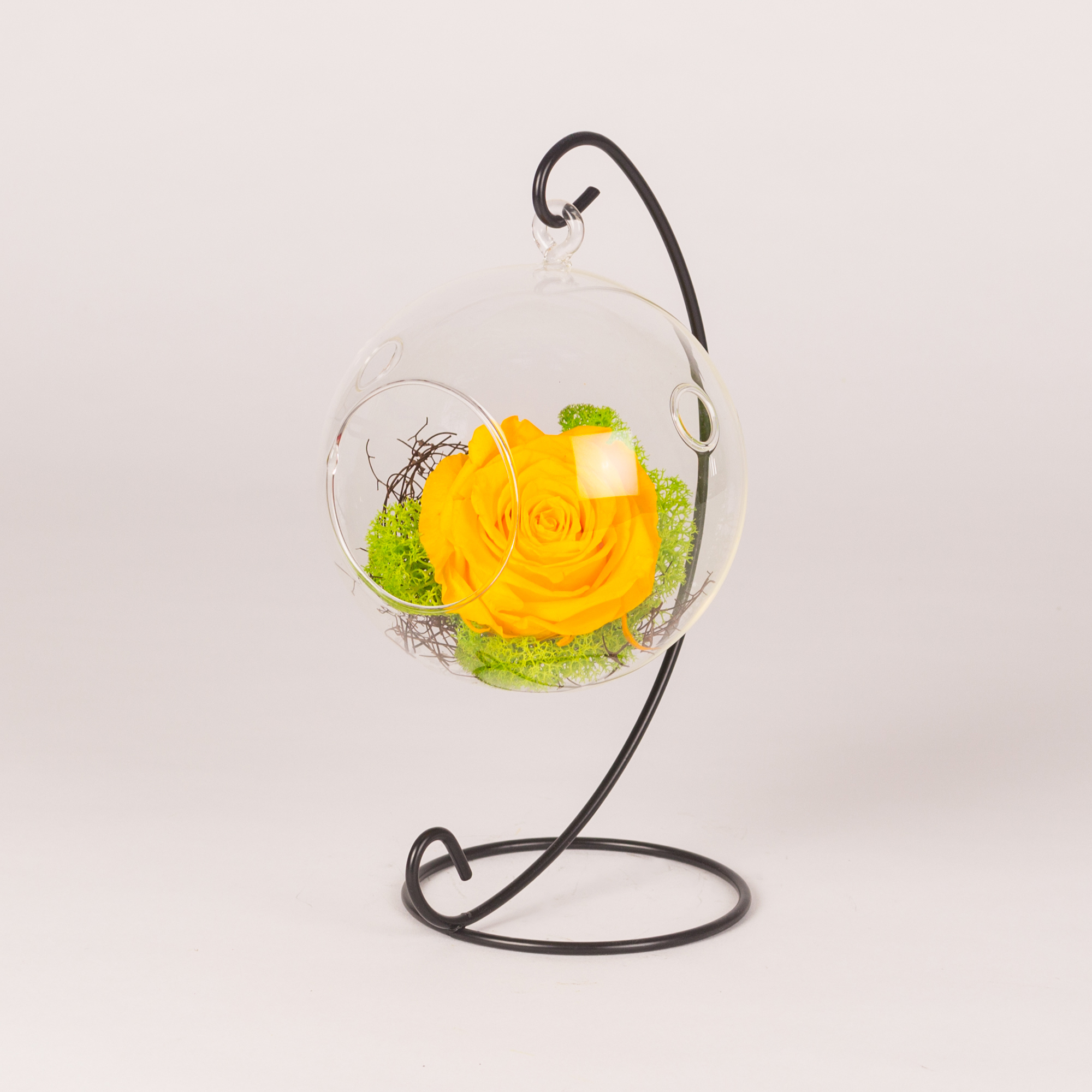 Terrarium dimensions: diameter 12cm, total height with black stand is 22cm. Preserved yellow rose and green moss