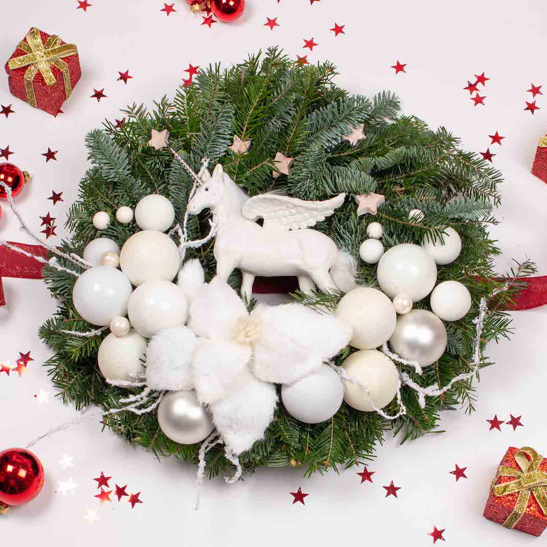 The wreath from the picture (some decorations may be slightly different) in a gift box with a bow