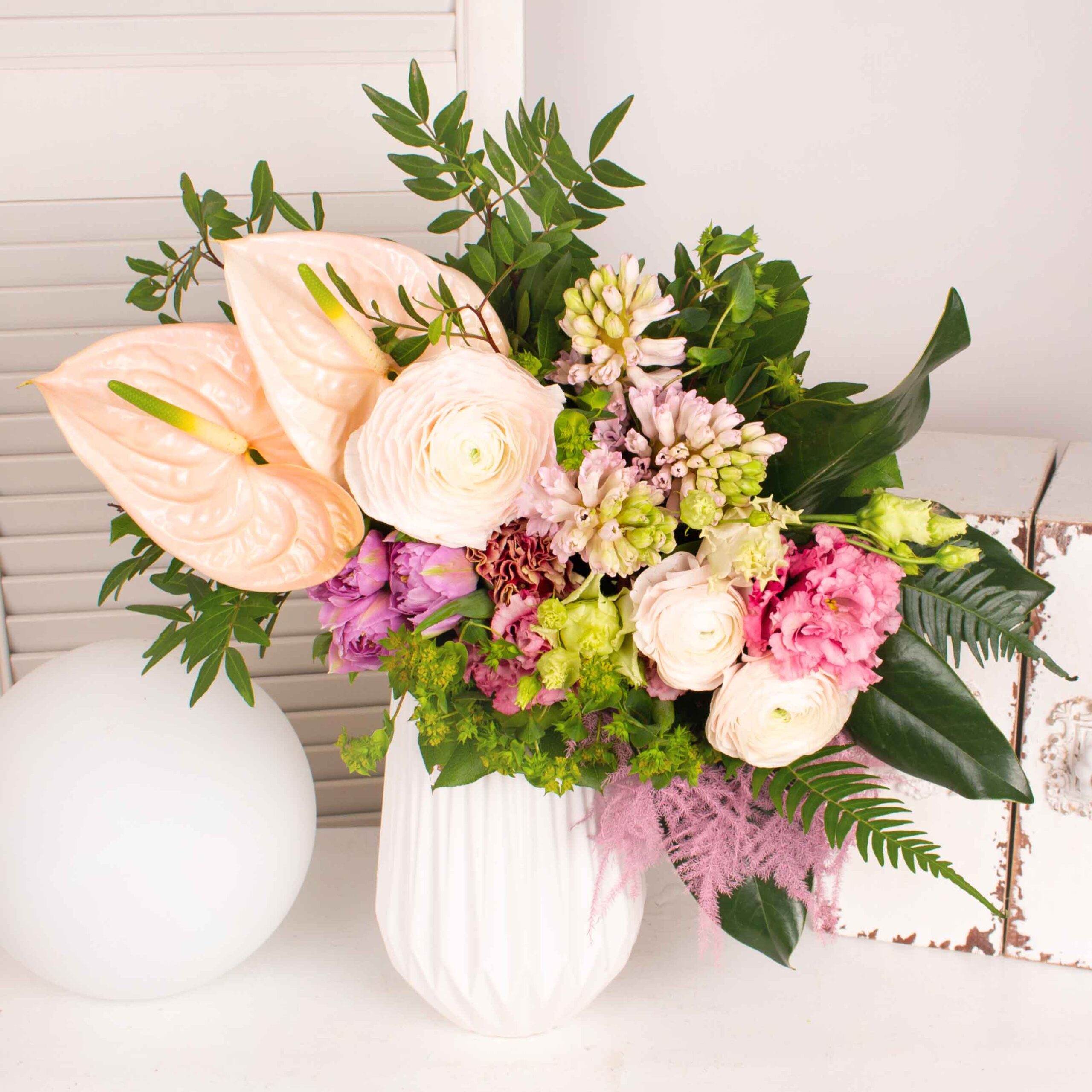 Bouquet with 2 pink anthuriums, 3 pink ranunculus, 3 pink hyacinths, 3 purple tulips, carnation, pink lisianthus, greenery and other decorative flowers.