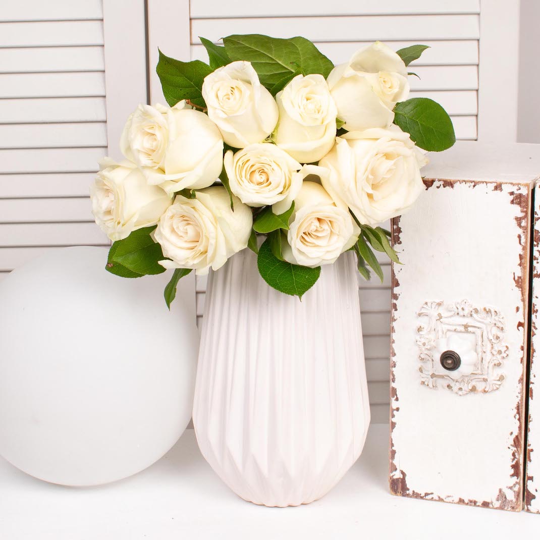 Flowers bring happiness to the people. This Bouquet of white roses will be a beautiful surprise to anyone. For sure this bouquet made by our florists at the Purple Flowers online Flower Shop can transform a regular day into a memorable one. Add your special message to the flowers and we will deliver it as soon as possible. There is no better way of saying „I love you!”, „Happy Birthday!” or „Congratulations!” than with a bouquet of flowers.