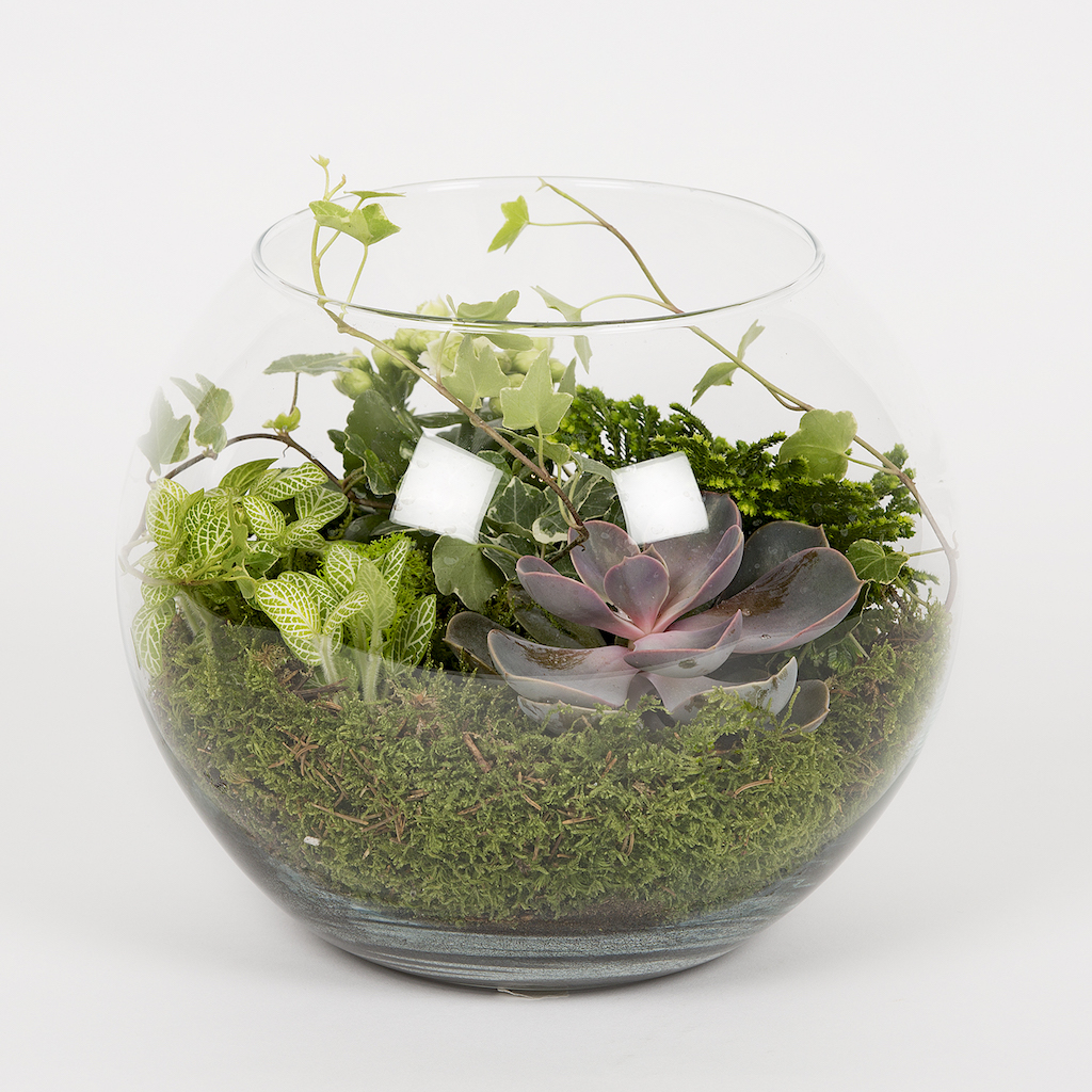 To get the most out of this plant arrangement or terrarium, please add a little water to the right of each plant whenever needed. As terrariums or plant arrangements are made in pots that do not allow excess water to drain away, the recommendation is to add water only when you see the substrate starting to dry out.