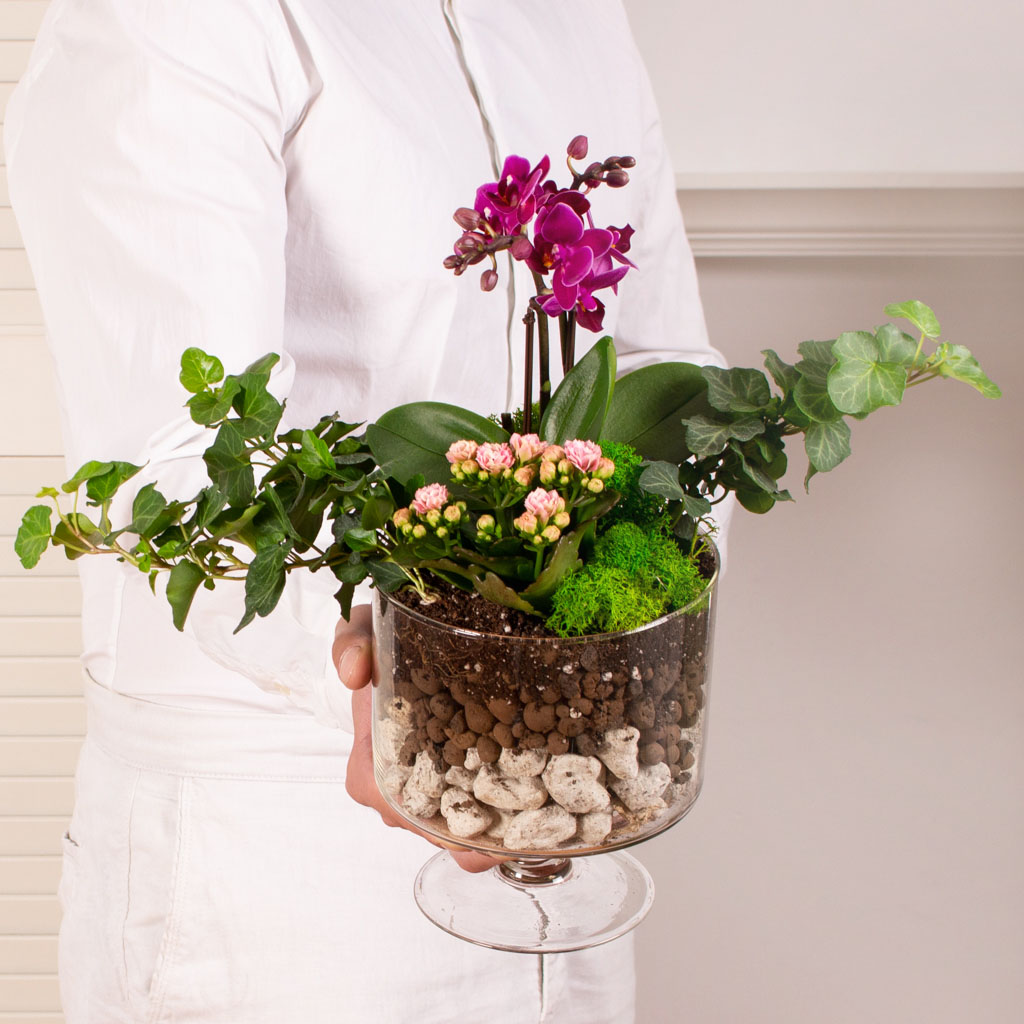We cherish everything nature has beautiful to offer, so we’ve prepared this special terrarium with kalanchoe, phalaenopsis and other plants for you or someone dear. Arrangements with green plants and flowering plants last longer and, moreover, purify the air in your home or office. This terrarium is the perfect gift for plant lovers.