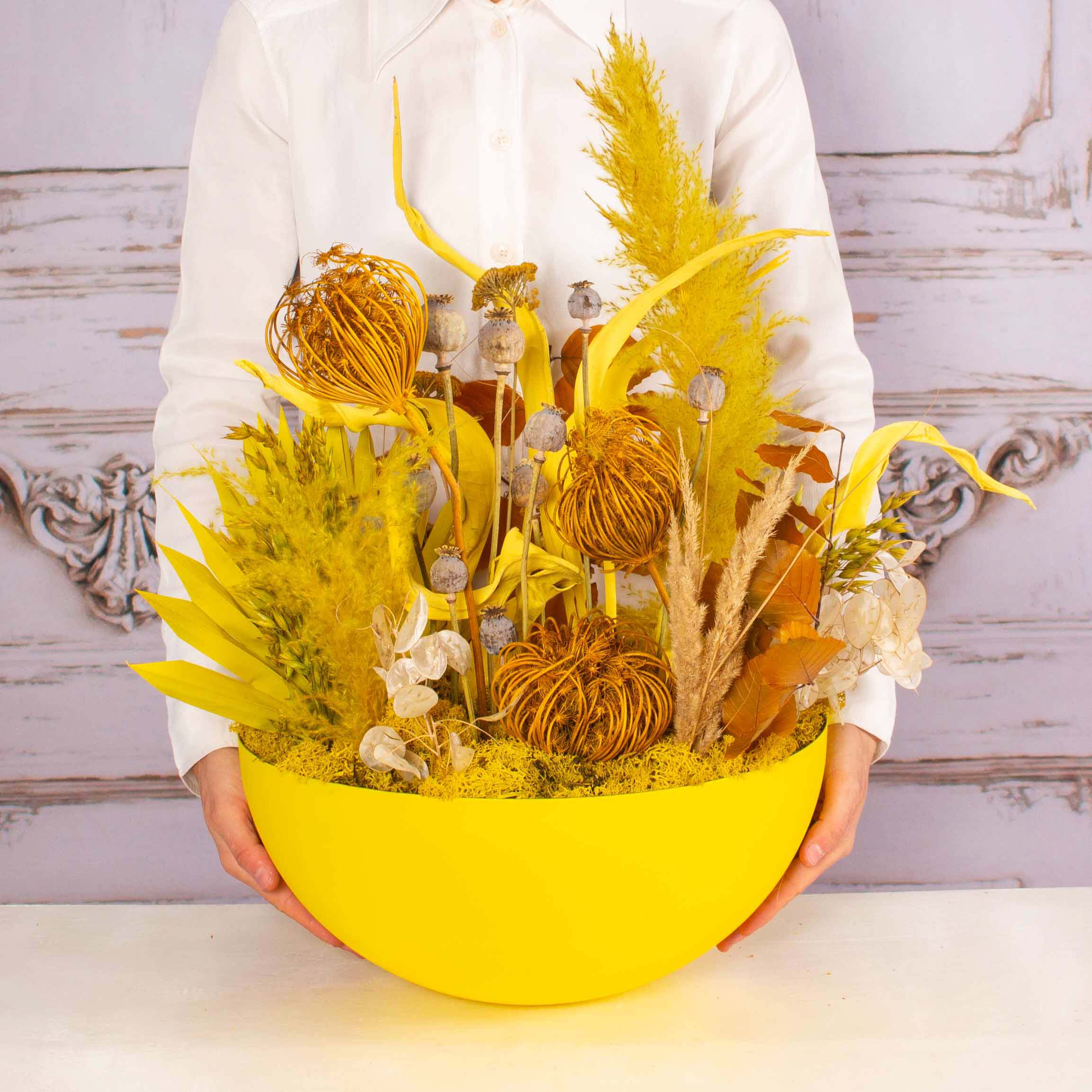 To enjoy this dried flowers arrangement as much as possible, please never wet the flowers with water, and place it in a room with as little dust as possible. Periodically, the arrangement should be cleaned of dust with a soft feather duster, just trying to cover the flowers to get the dust off them. The arrangement should only be placed indoors, out of direct sunlight and away from air conditioners and heaters. The recommended temperature for keeping the flowers should not exceed 20-22 degrees Celsius.
