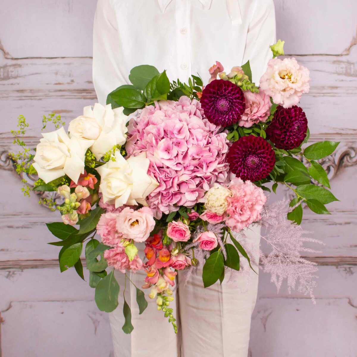 Flowers bring happiness to the people. This Bouquet of hydrangea and roses will be a beautiful surprise to anyone. For sure this bouquet made by our florists at the Purple Flowers online Flower Shop can transform a regular day into a memorable one. Add your special message to the flowers and we will deliver it as soon as possible. There is no better way of saying „I love you!”, „Happy Birthday!” or „Congratulations!” than with a bouquet of flowers.