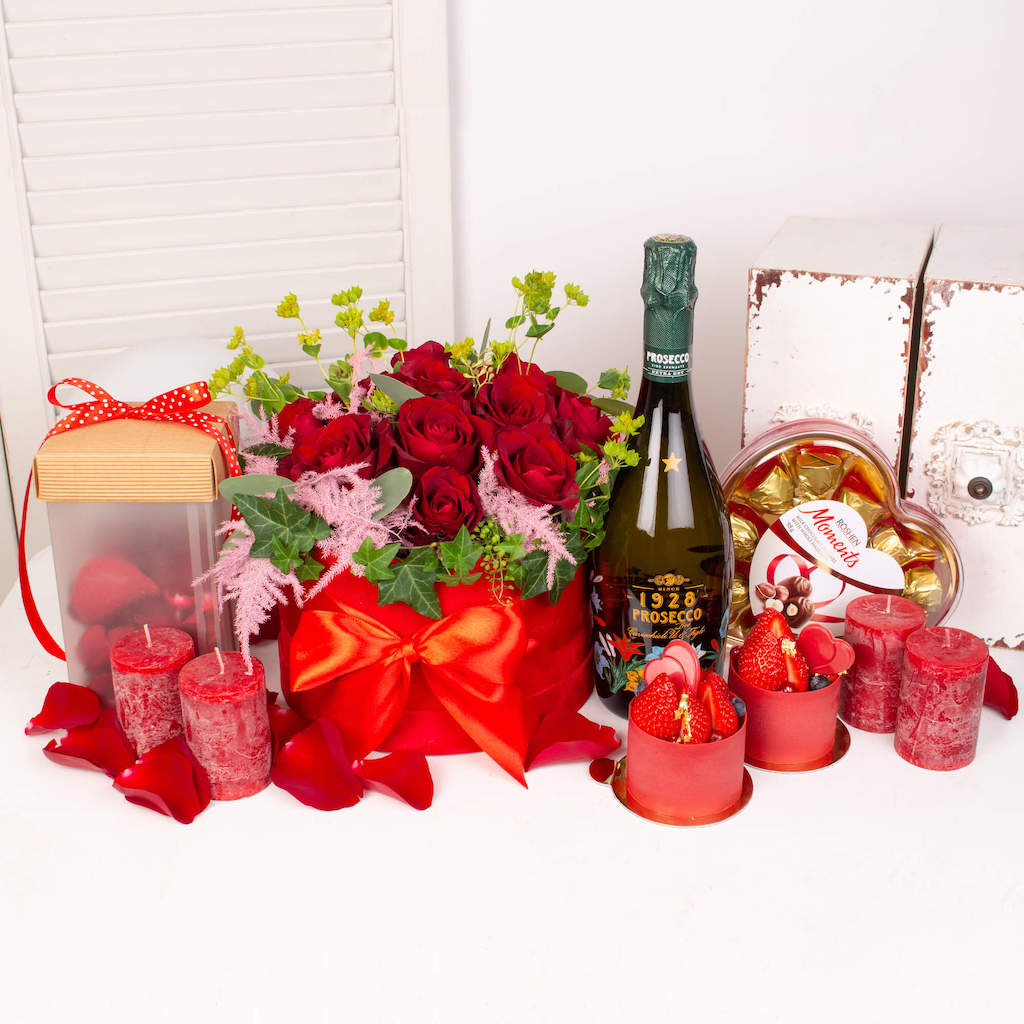 Red roses, Cavicchioli Prosecco Extra Dry, mousse cake, Roshen chocolate pralines with hazelnuts, scented candles and a box of rose petals