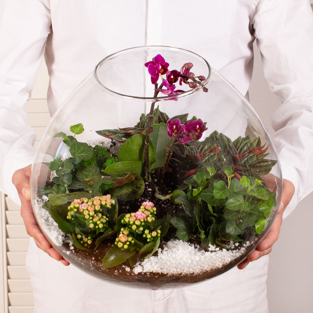 We cherish everything nature has beautiful to offer, so we’ve prepared this special terrarium with phalaenopsis and peperomia for you or someone dear. Arrangements with green plants and flowering plants last longer and, moreover, purify the air in your home or office. This terrarium is the perfect gift for plant lovers.