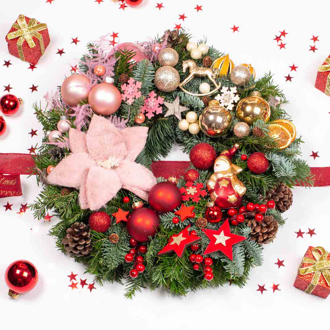 The wreath from the picture (some decorations may be slightly different) in a gift box with a bow