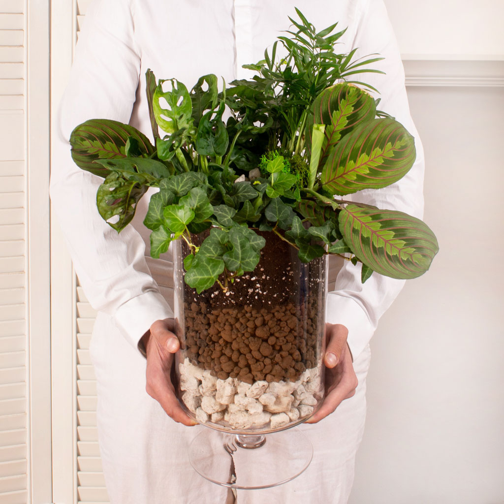 To get the most out of this plant arrangement or terrarium, please add a little water to the right of each plant whenever needed. As terrariums or plant arrangements are made in pots that do not allow excess water to drain away, the recommendation is to add water only when you see the substrate starting to dry out.