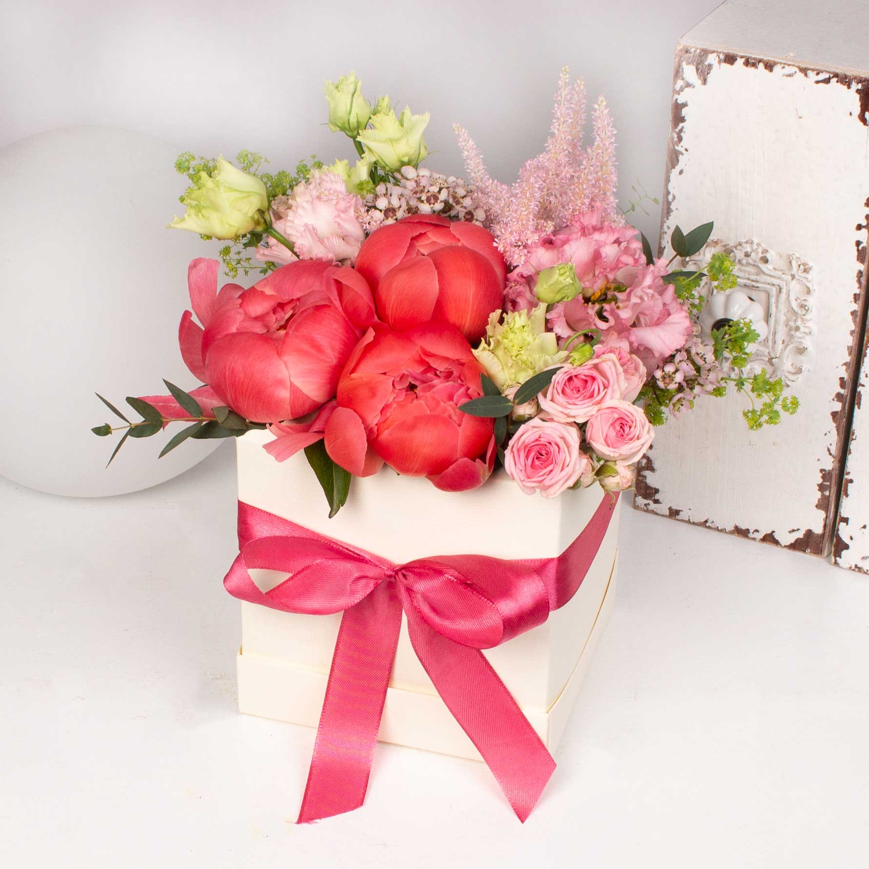 Ivory box with 3 coral peonies, pink lisianthus, mini roses, greenery and other decorative flowers.