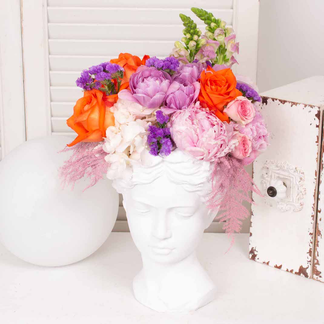 Be the first to review “Pink peonies and orange roses in white statue vase”