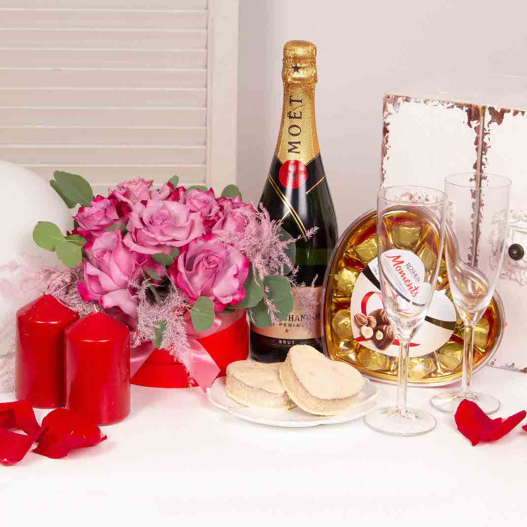 This gift contains 9 pink roses arrangement in red box, red candles, Adore white chocolate and coconut flakes cakes, Roshen chocolate pralines, Moet champagne and 2 champagne glasses