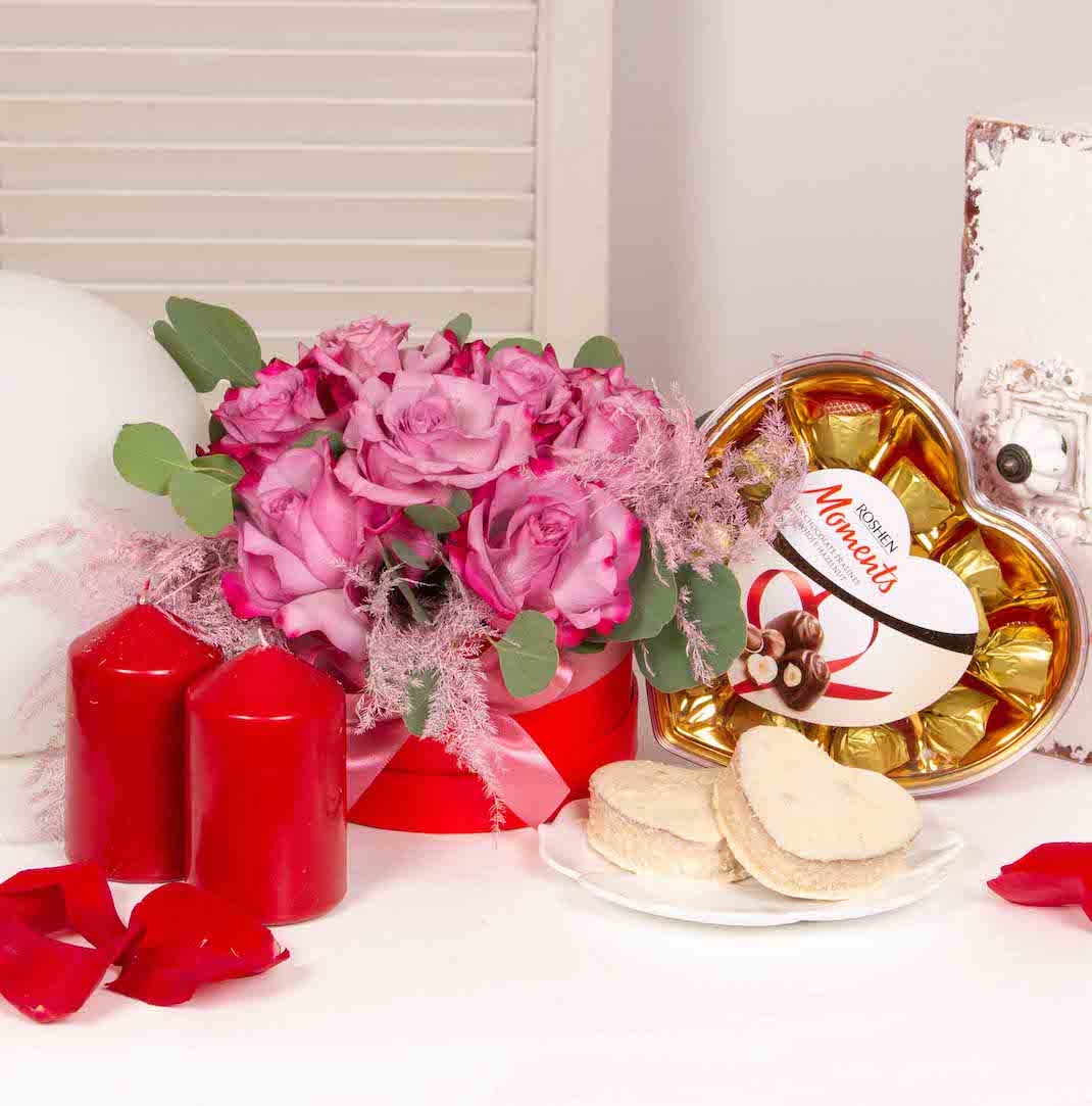 This gift contains 9 pink roses arrangement in red box, red candles, Adore white chocolate and coconut flakes cakes and Roshen chocolate pralines.