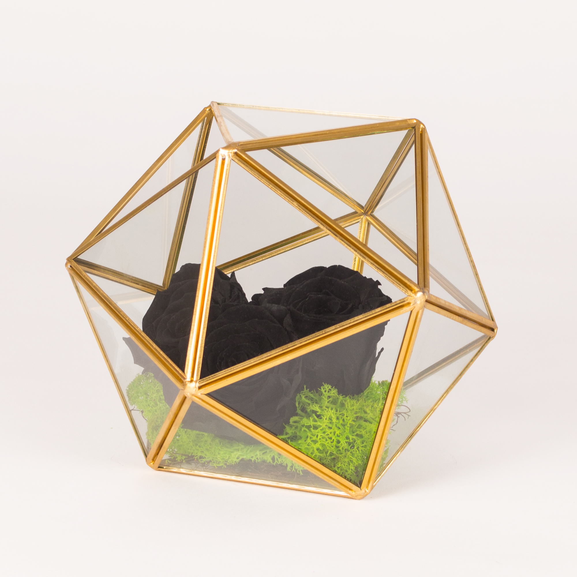 Prism sphere diam20cm with 3 black preserved roses, green moss and small nest.