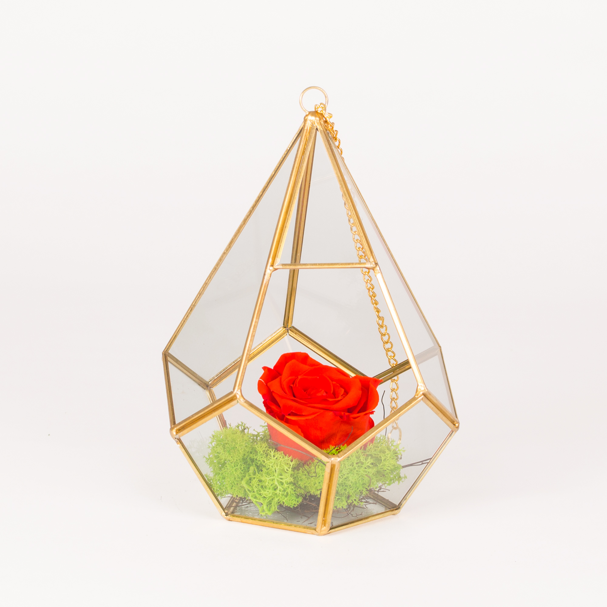 Diamond prism L15cm h23cm with orange preserved rose, green moss and small nest.