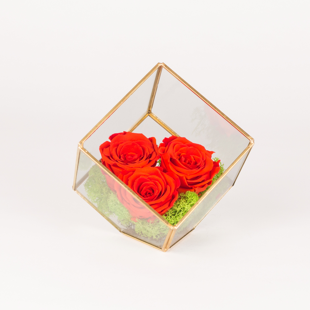 Terrarium dimensions: diameter 12cm, total height with black stand is 22cm. Preserved orange roses and green moss