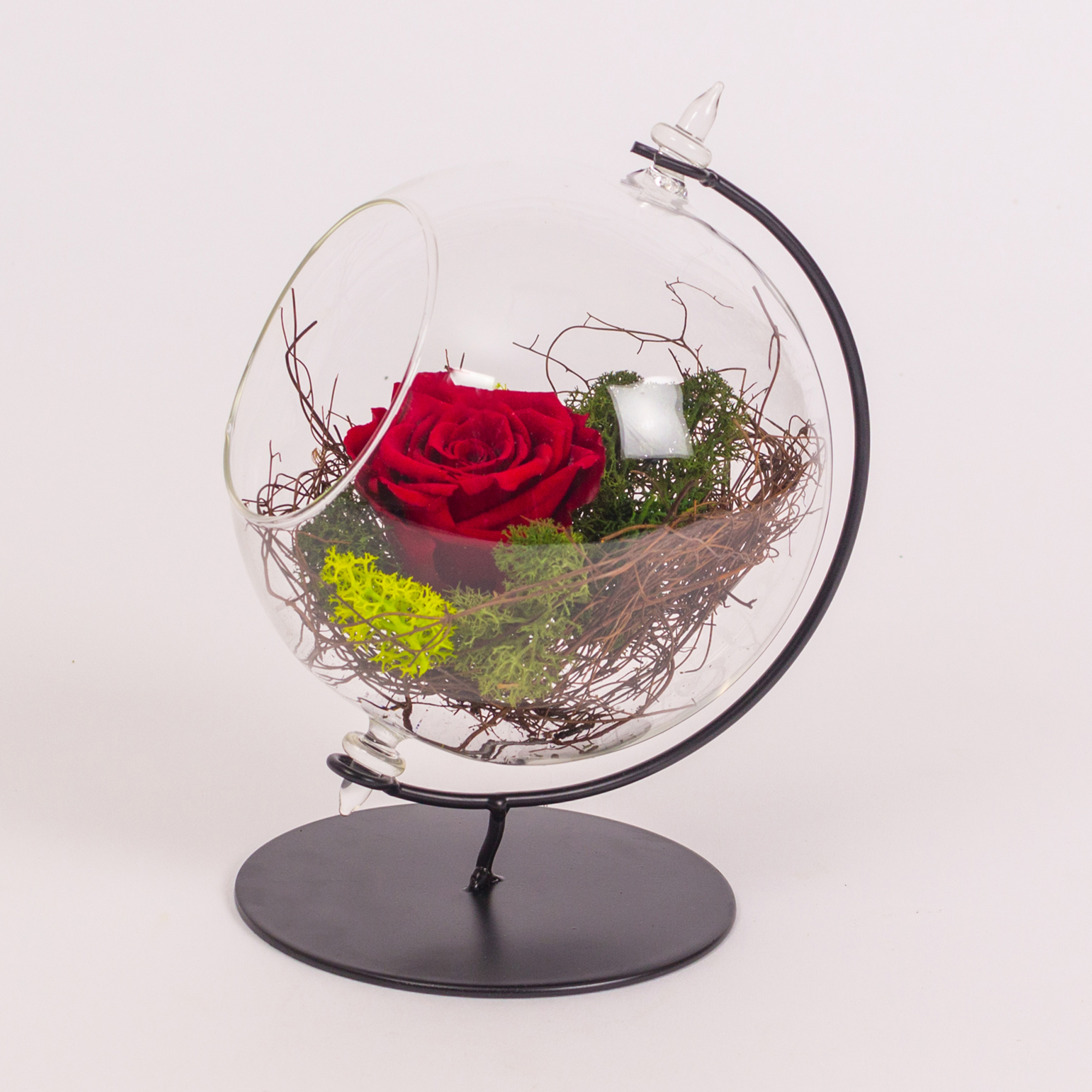 Glass globe d16cm h20cm with red preserved rose, green moss and small nest.