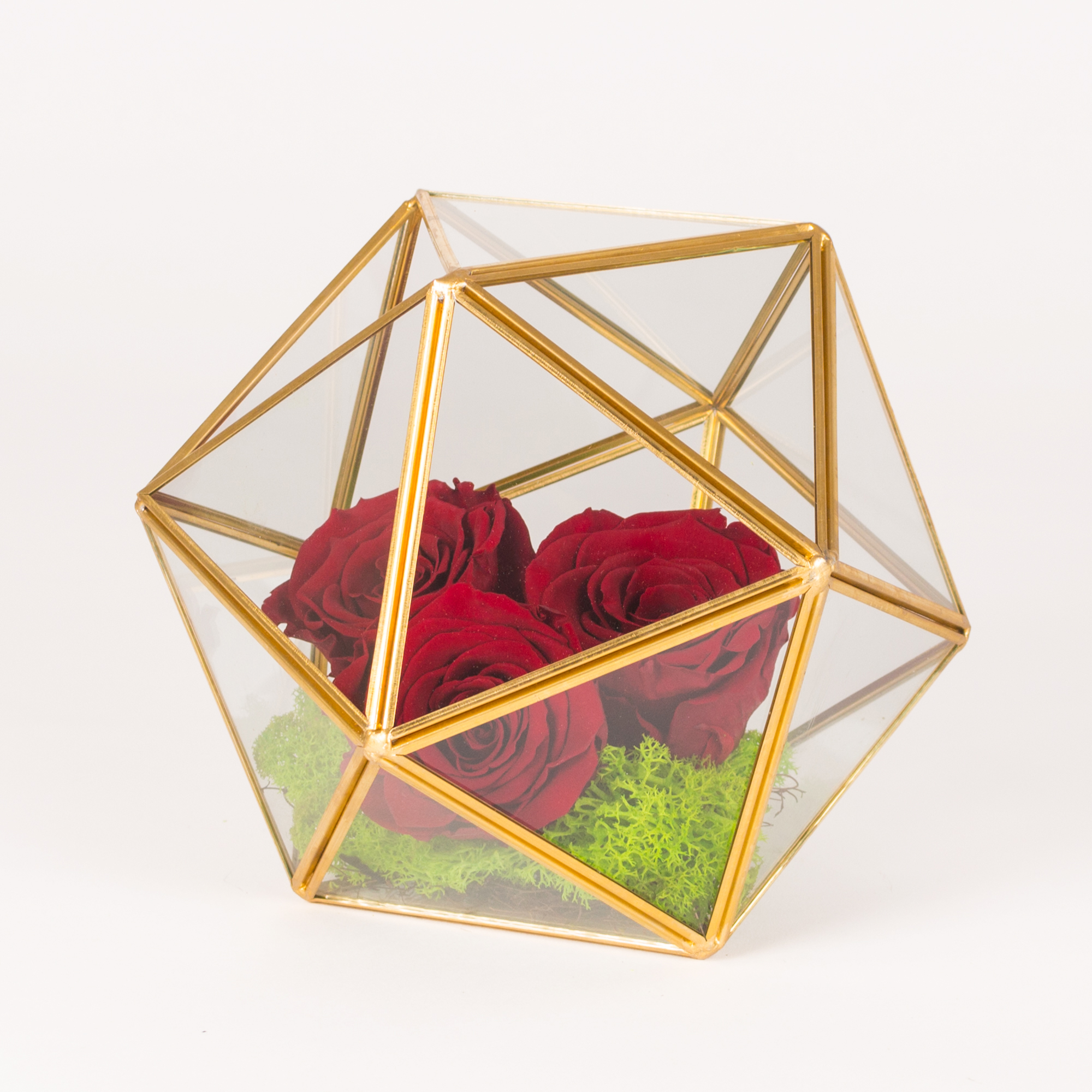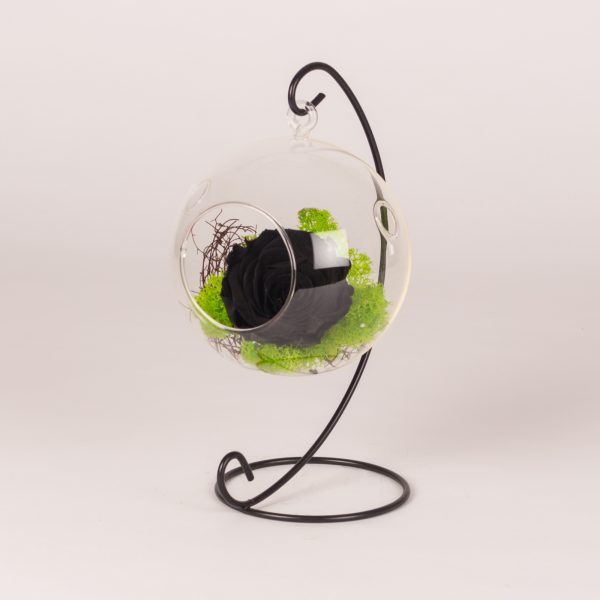 Terrarium dimensions: diameter 12cm, total height with black stand is 22cm. Preserved red roses and green moss