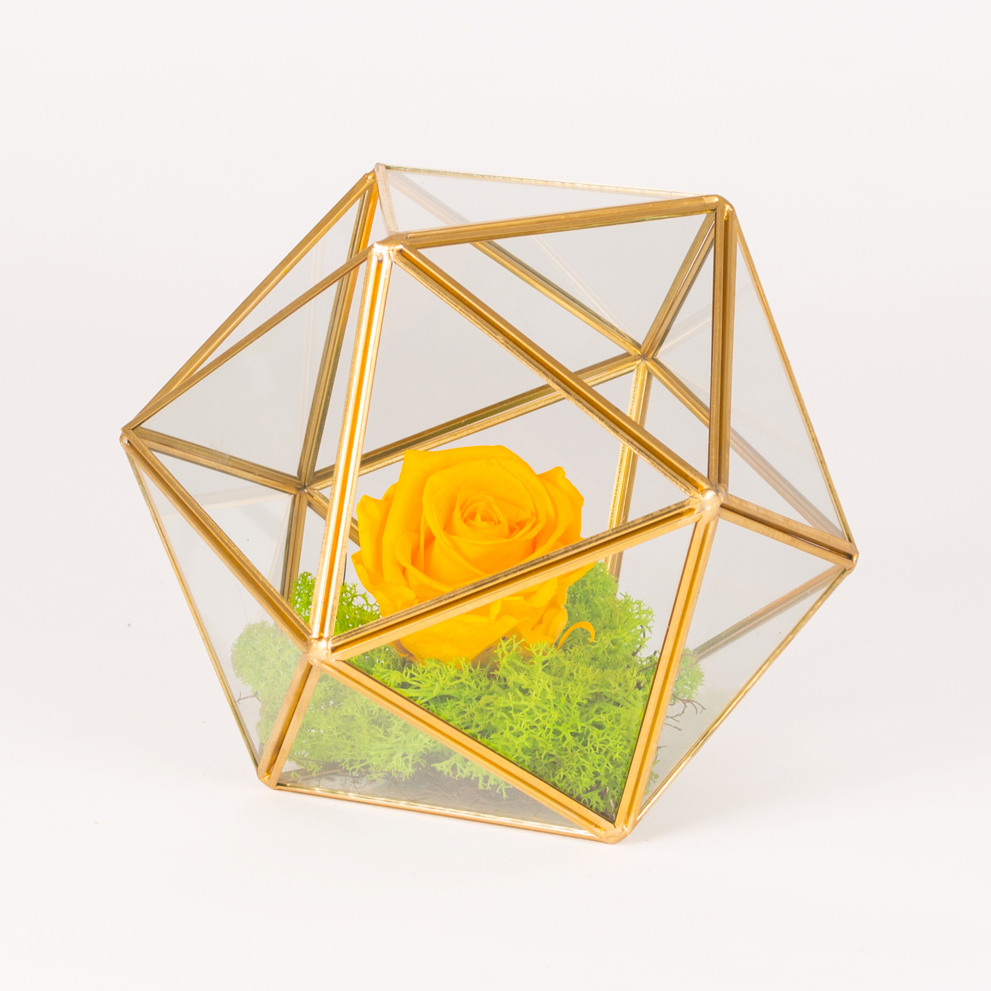 Prism sphere diam20cm with preserved yellow rose, green moss and small nest.