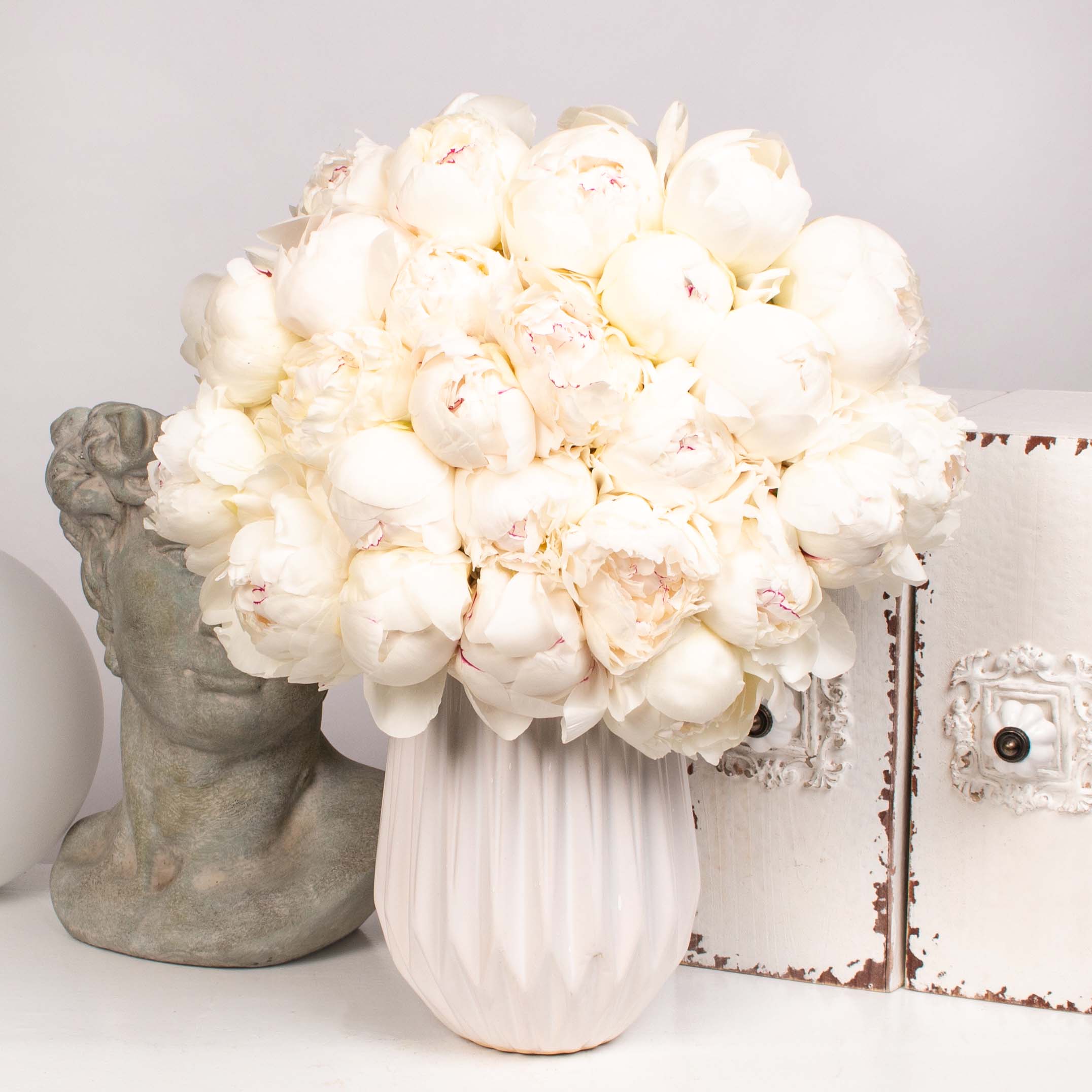 Flowers bring happiness to the people. This Bouquet of 25 white peonies will be a beautiful surprise to anyone. For sure this bouquet made by our florists at the Purple Flowers online Flower Shop can transform a regular day into a memorable one. Add your special message to the flowers and we will deliver it as soon as possible. There is no better way of saying „I love you!”, „Happy Birthday!” or „Congratulations!” than with a bouquet of flowers.