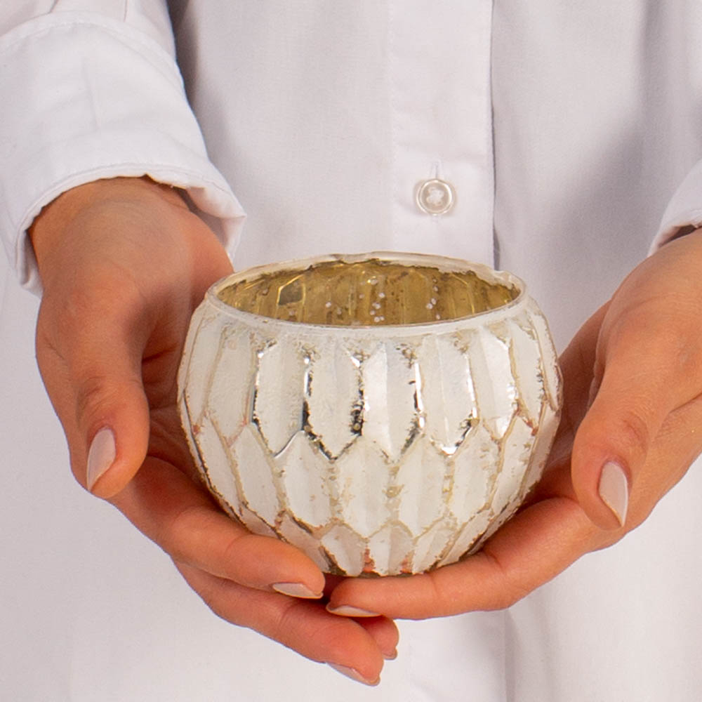 Contains: Round white glass candle holder 7.5 x 10 cm