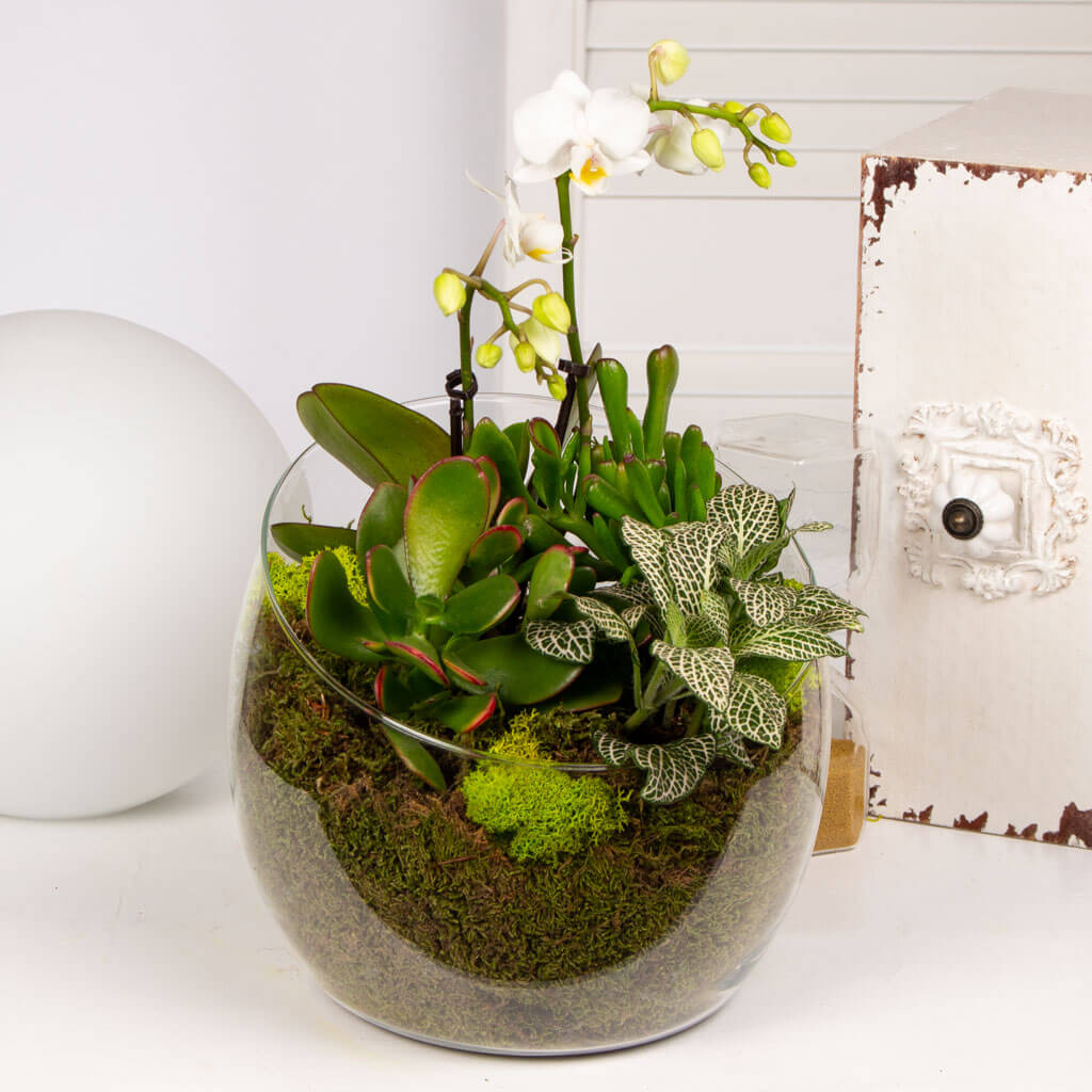 We cherish everything nature has beautiful to offer, so we’ve prepared this special terrarium with phalaenops and other plants for you or someone dear. Arrangements with green plants and flowering plants last longer and, moreover, purify the air in your home or office. This terrarium is the perfect gift for plant lovers.