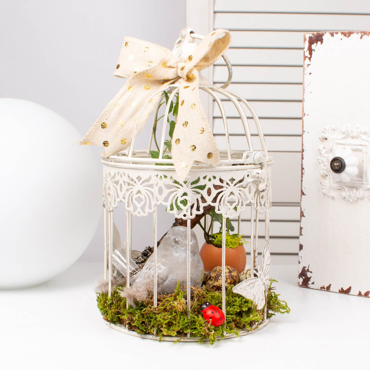 Cage with bow, cement bird, ivy, green moss and other decorative elements.