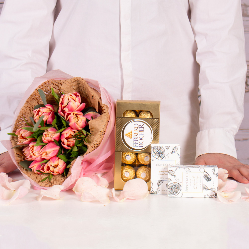 This gift contains a bouquet of 11 double pink tulips, Ferrero Rocher pralines, purified soap and exfolianting soap with cinnamon and coffee