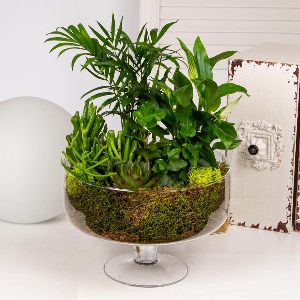 To get the most out of this plant arrangement or terrarium, please add a little water to the right of each plant whenever needed. As terrariums or plant arrangements are made in pots that do not allow excess water to drain away, the recommendation is to add water only when you see the substrate starting to dry out.