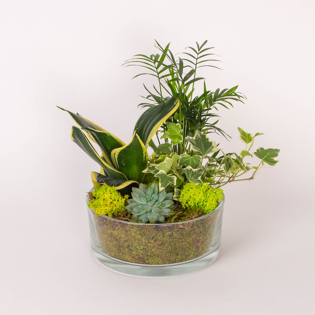 To get the most out of this plant arrangement or terrarium, please add a little water to the right of each plant whenever needed. As terrariums or plant arrangements are made in pots that do not allow excess water to drain away, the recommendation is to add water only when you see the substrate starting to dry out.