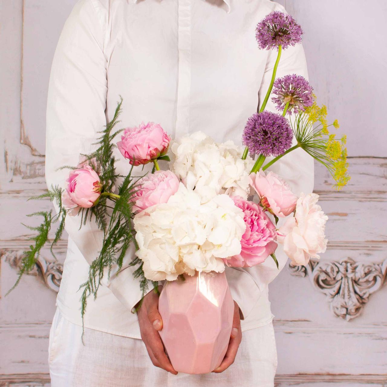 Vase daira 13 x 20 cm, 1 allium, 3 pink peonies, 6 asparagus, 1 dill, 1 hydrangea, 2 reindeer spring moss, greenery and other decorative flowers.