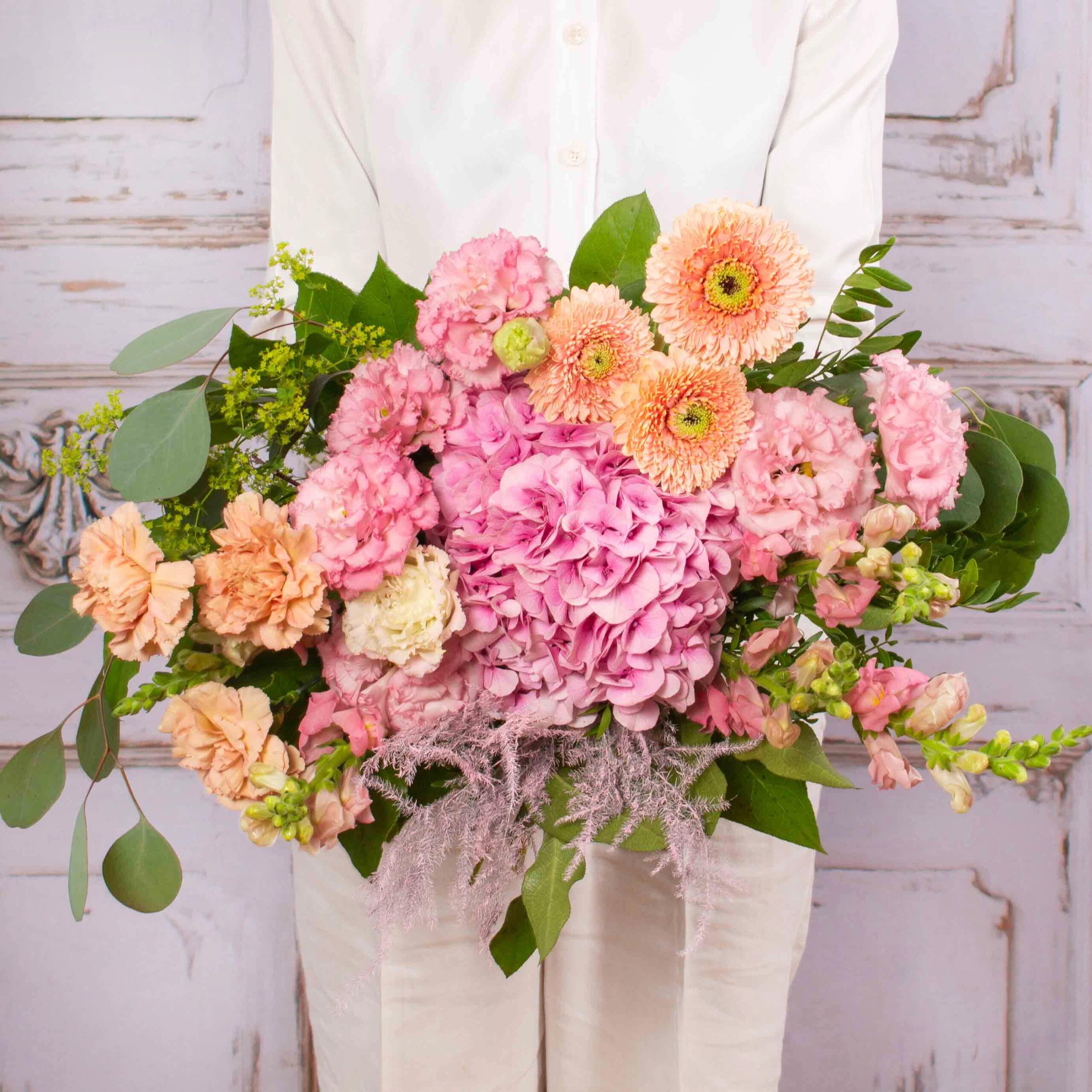 Bouquet with 3 pink hydrangea, 5 pink anthirinum, 3 pink lisianthus, 3 carnations, greenery and other flowers