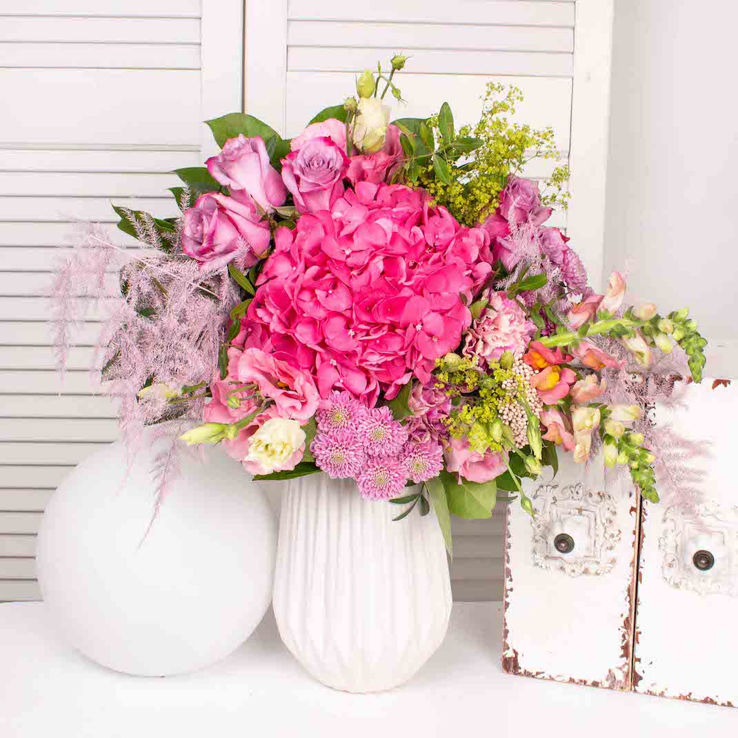 Bouquet with pink hydrangea, 5 pink roses, 2 anthirinum, greenery and other flowers