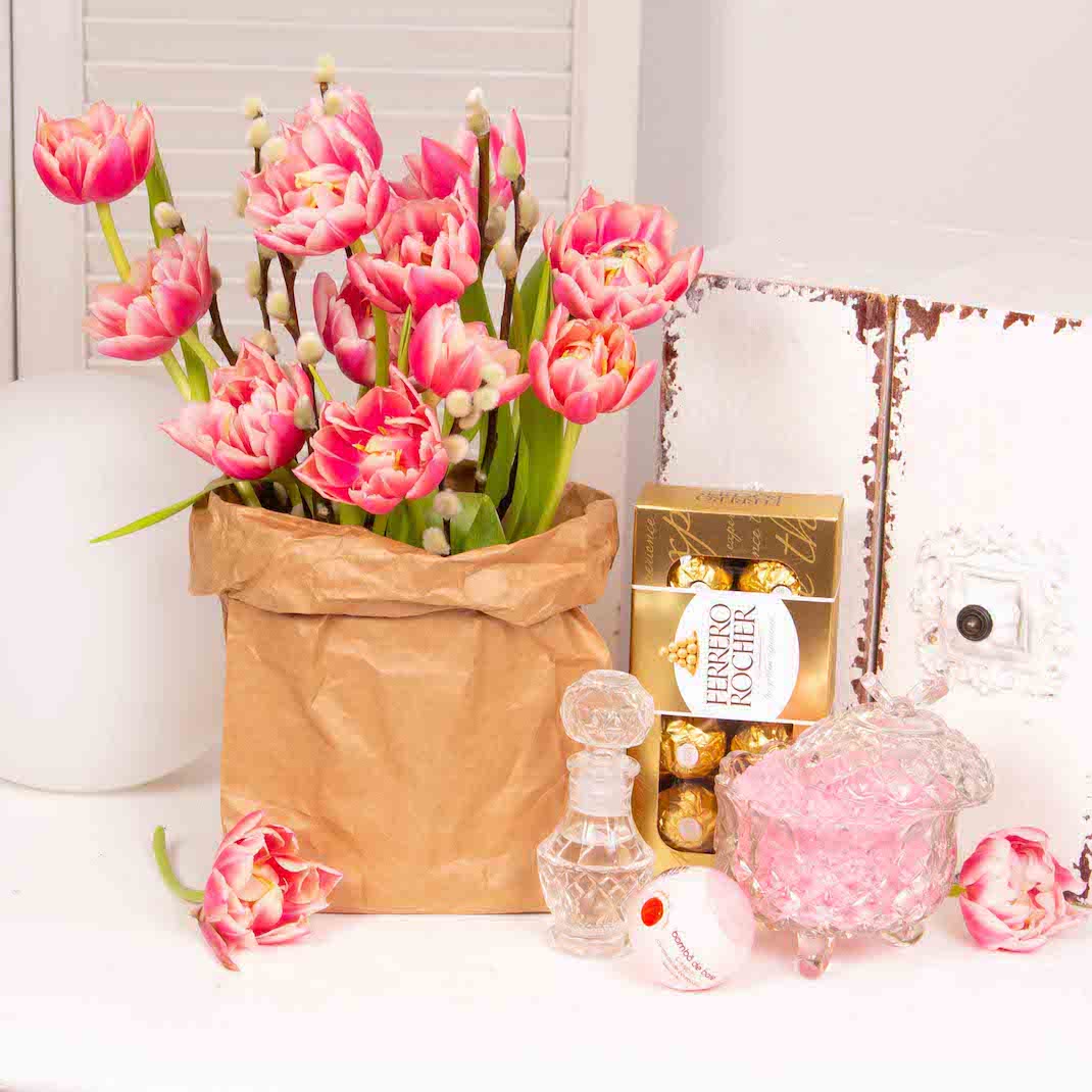 The most special occasions need special gifts. Order this gift with tulips, relaxation oil, bath salt, bath bomb, chocolate pralines and turn an ordinary day into a beautiful memory. Designed specifically for women, whether you want to give it to your mother, girlfriend, colleagues, or other women you know, they will surely appreciate that you’ve thought of them.
