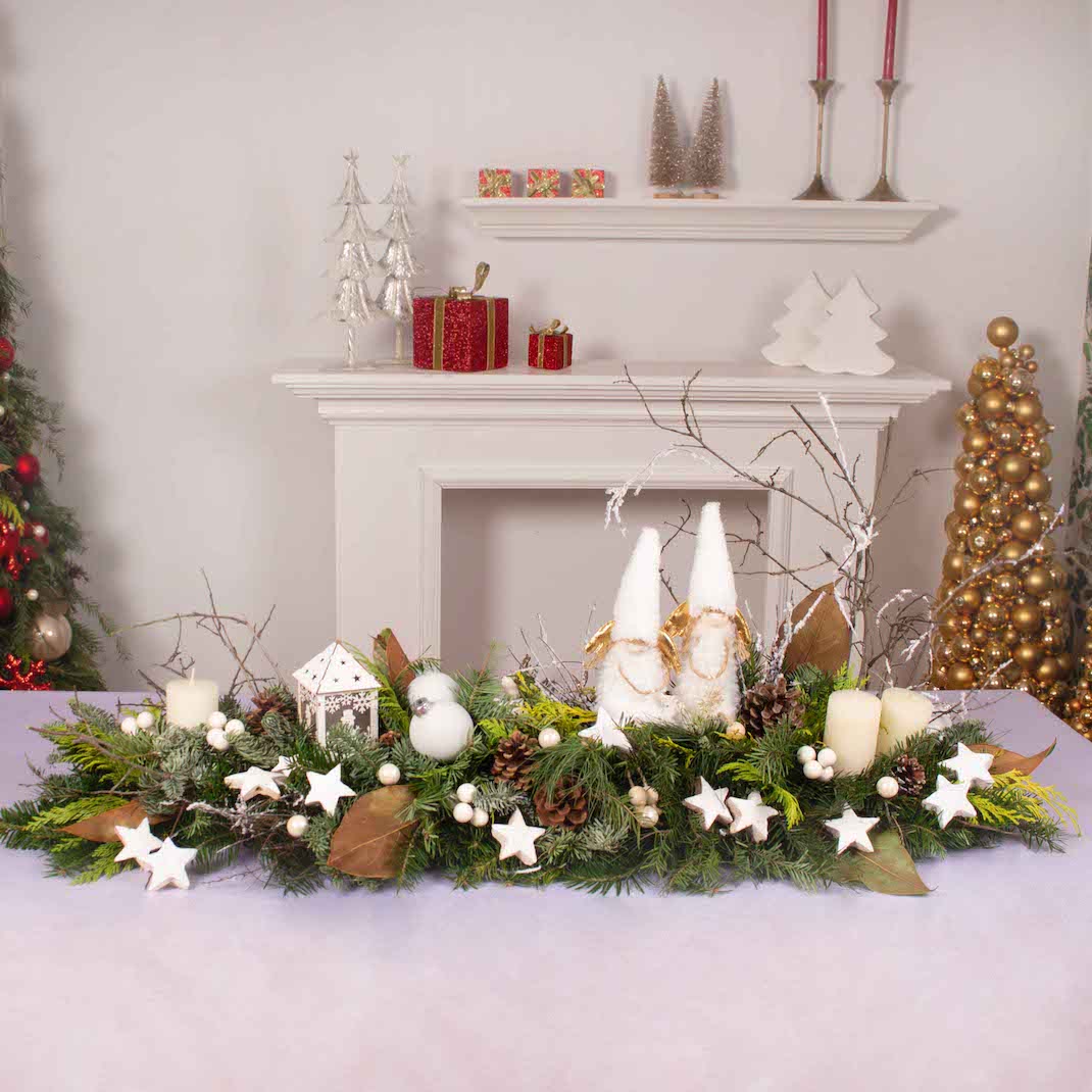 Christmas is the most beautiful time of the year and reminds us of childhood. We all like to give and receive beautiful presents. And for sure we love to make our beloved ones happy. This Christmas arrangement with natural fir , globes and figurines is the perfect gift to surprise our friends and family. We need to add only a cup of hot tea, carols and maybe a fireplace. Inspired by this jolly picture we created all these beautiful Christmas arrangements.