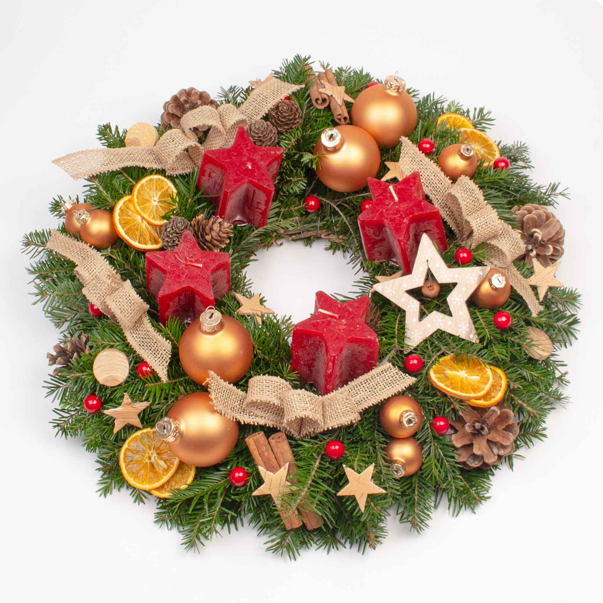 The wreath from the picture (some decorations may be slightly different) in a gift box with a bow