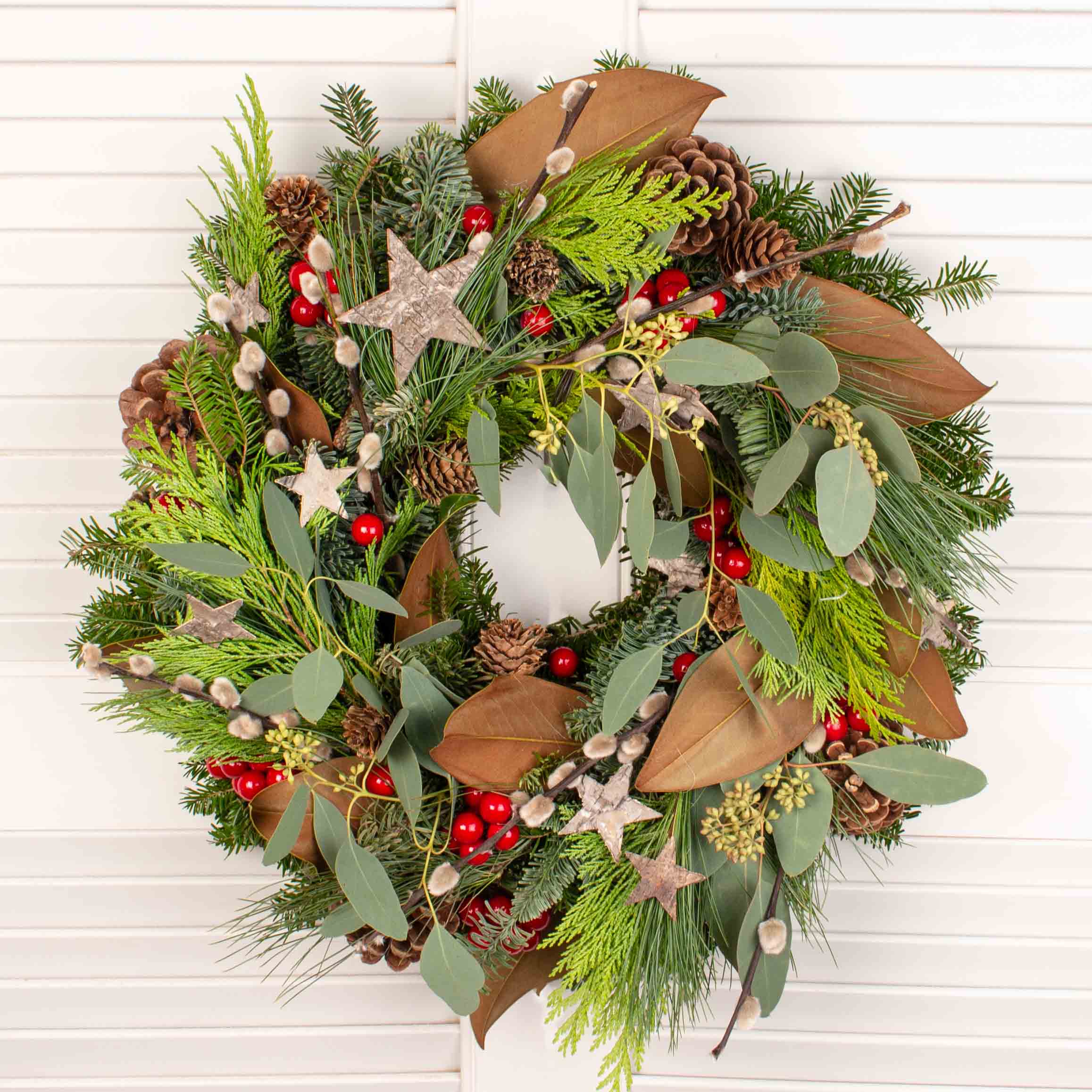 The wreath from the picture (some decorations may be slightly different) in a gift box with a bow
