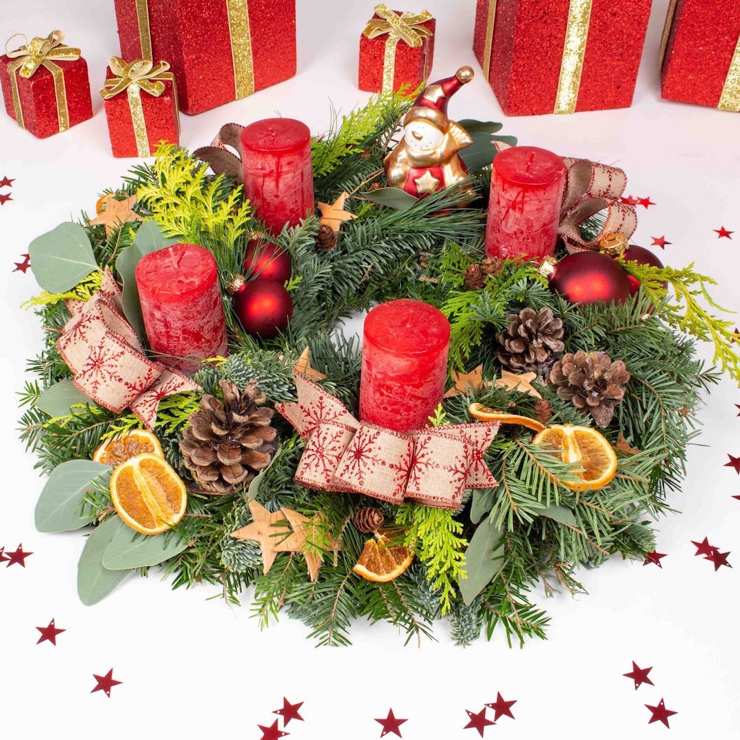 The wreath from the picture (some decorations may be slightly different) in a gift box with a bow